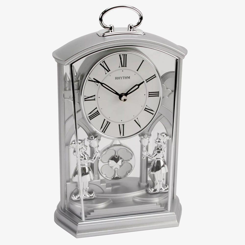 This elegant clock boasts an ornate design, featuring Rhythm's silent 'comfort swing' pendulum and charming elfin footmen on either side. The oval clock face offers a minimalist aesthetic, with a Roman dial and black sword-shaped clock hands. Powered by an ultra-precise quartz movement, this clock combines beauty with exceptional accuracy.