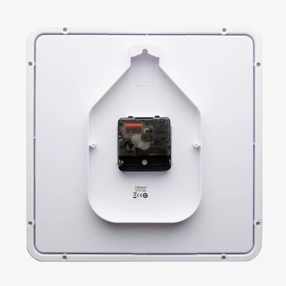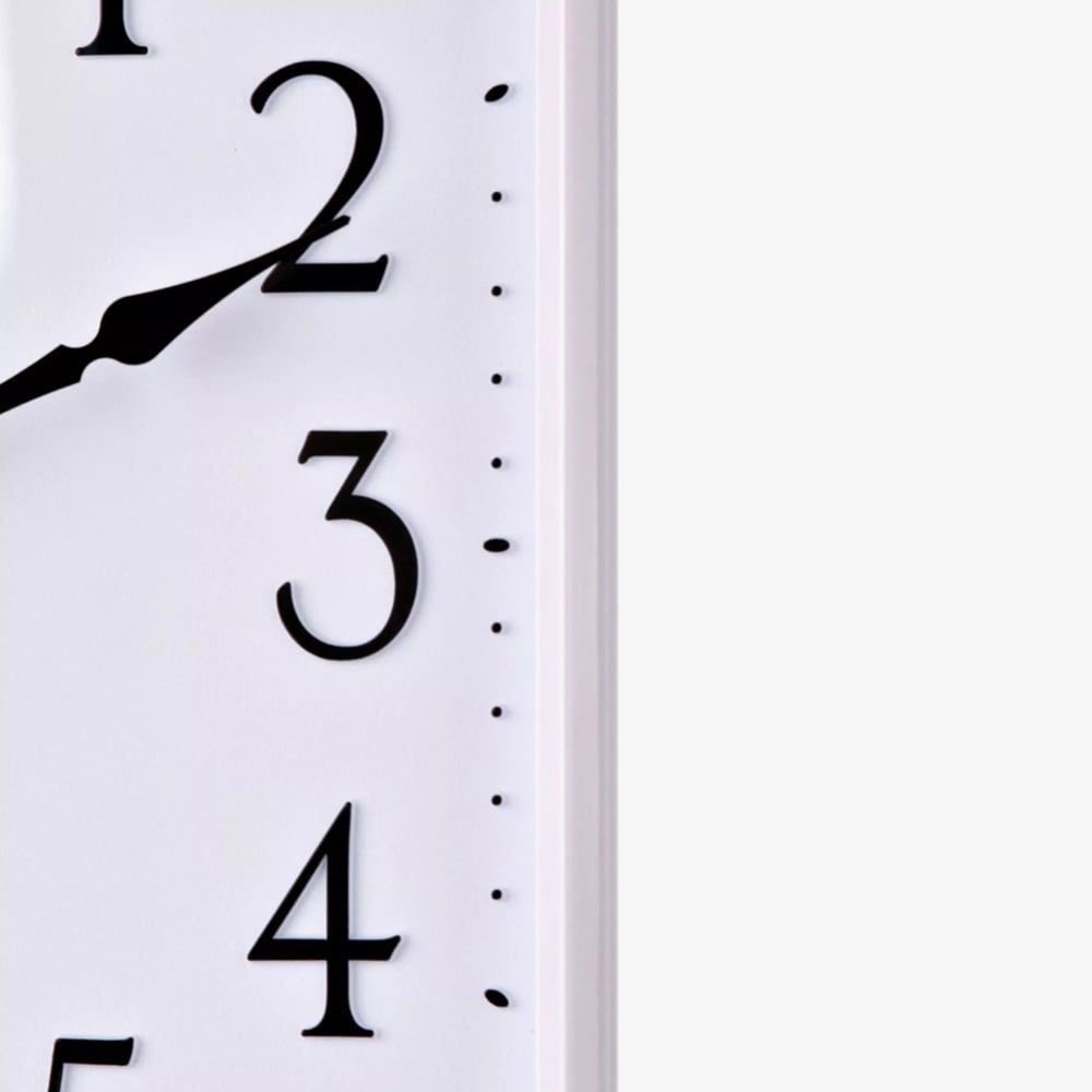 This square wall clock from Rhythm combines elegance and modern design, making it a perfect addition to any home or office. The white square plastic frame with smooth corners contrasts beautifully with the large black 3D Arabic numerals, creating a bold, easy-to-read display. Black spade clock hands enhance the sleek look, while the silent, silky movement ensures quiet timekeeping.