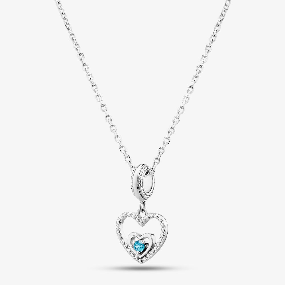 Rosa Lea openwork love heart dangle charm made from sterling silver with a smaller love heart inside and a blue cubic zirconia stone set in three claws representing December’s birthstone colour. This charm comes with a fine silver belcher chain measuring 18 inches long and weighing 2.3 grams.