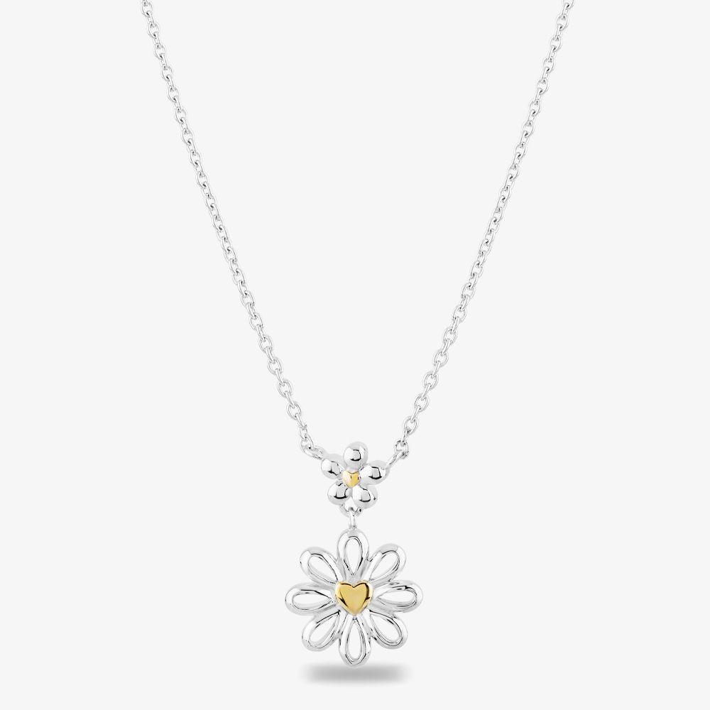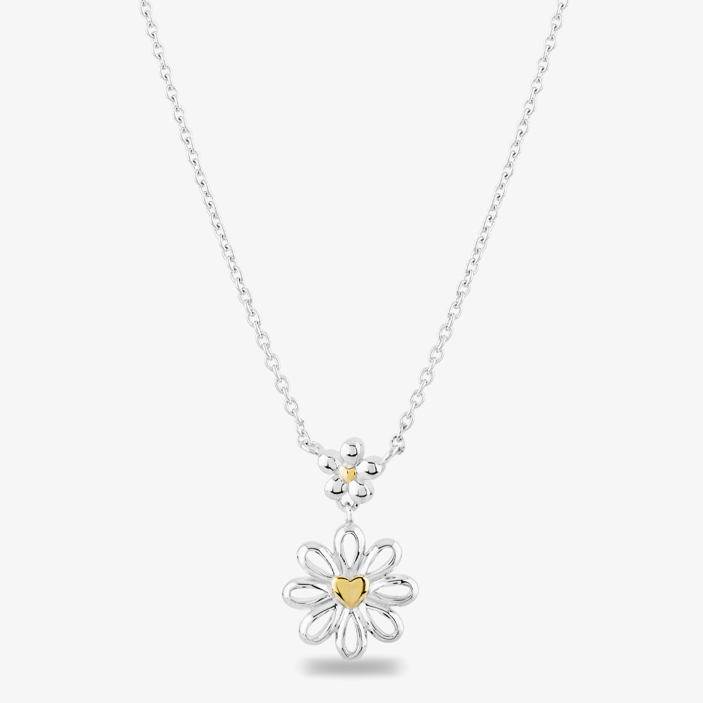 Rosa Lea Ladies Double Daisy Necklace AM-2THB028706. This beautiful necklace measures 45cm with a belcher chain. The necklace features a sterling silver flower with a gold-plated heart-shaped centre, and a large sterling silver daisy pendant with a gold-plated heart-shaped centre. A perfect accessory for everyday wear.