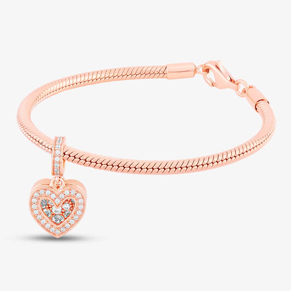 Rosa Lea Rose Gold Cubic Zircona Double Heart Shaped Charm AM-2THB032006 is made from sterling silver and set with silver cubic zirconia. Two rose gold heart charms both with stone covered fronts and hoop. Rosa Lea charms are universal and made to fit onto almost any charm bracelet or bangle.