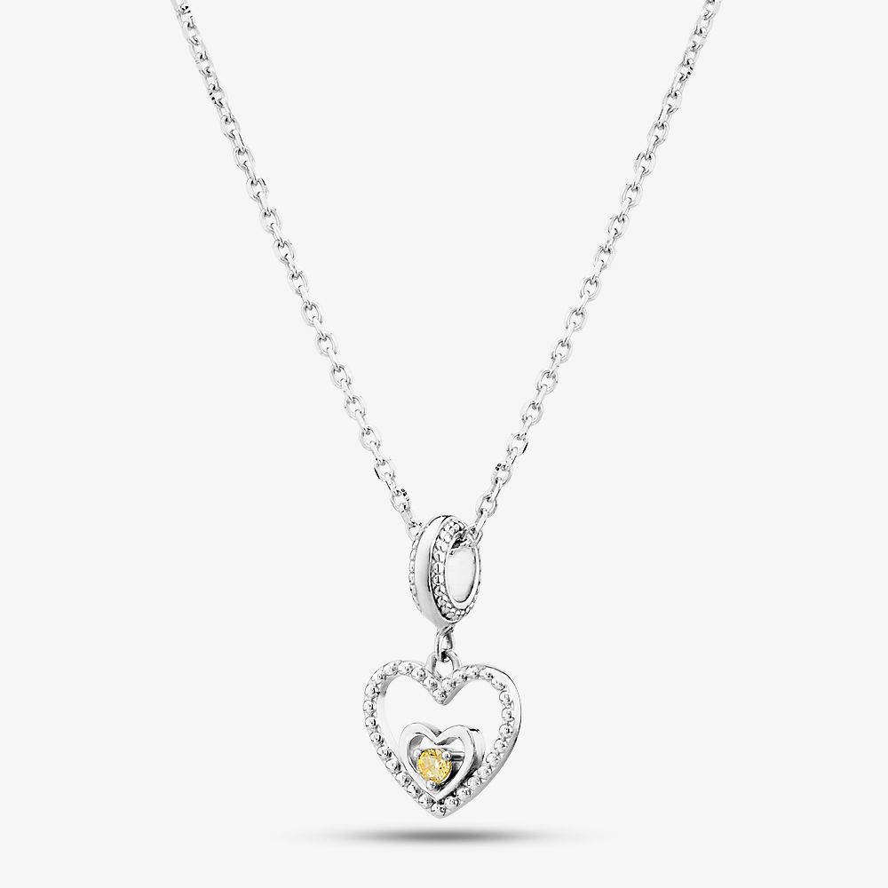 Rosa Lea openwork love heart dangle charm made from sterling silver with a smaller love heart inside and a yellow cubic zirconia stone set in three claws representing November’s birthstone colour. This charm comes with a fine silver belcher chain measuring 18 inches long and weighing 2.3 grams.