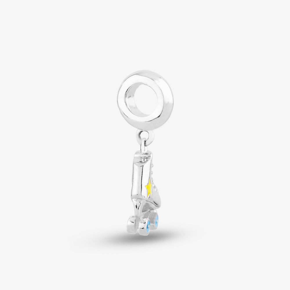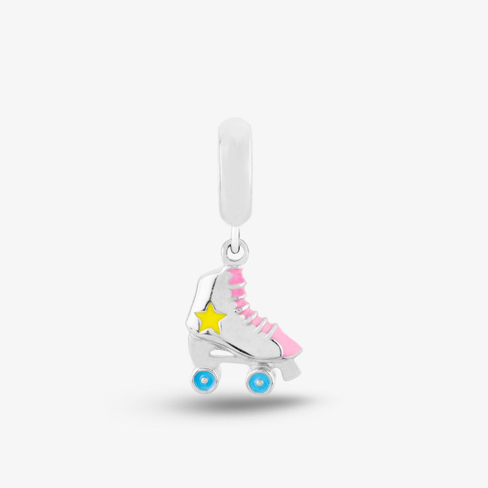 Rosa Lea Roller Skates Dangle Charm AM-2THB029004 is crafted from sterling silver. This delicate dangle charm features a quirky roller skate boot with pink, blue and yellow enamel detailing.