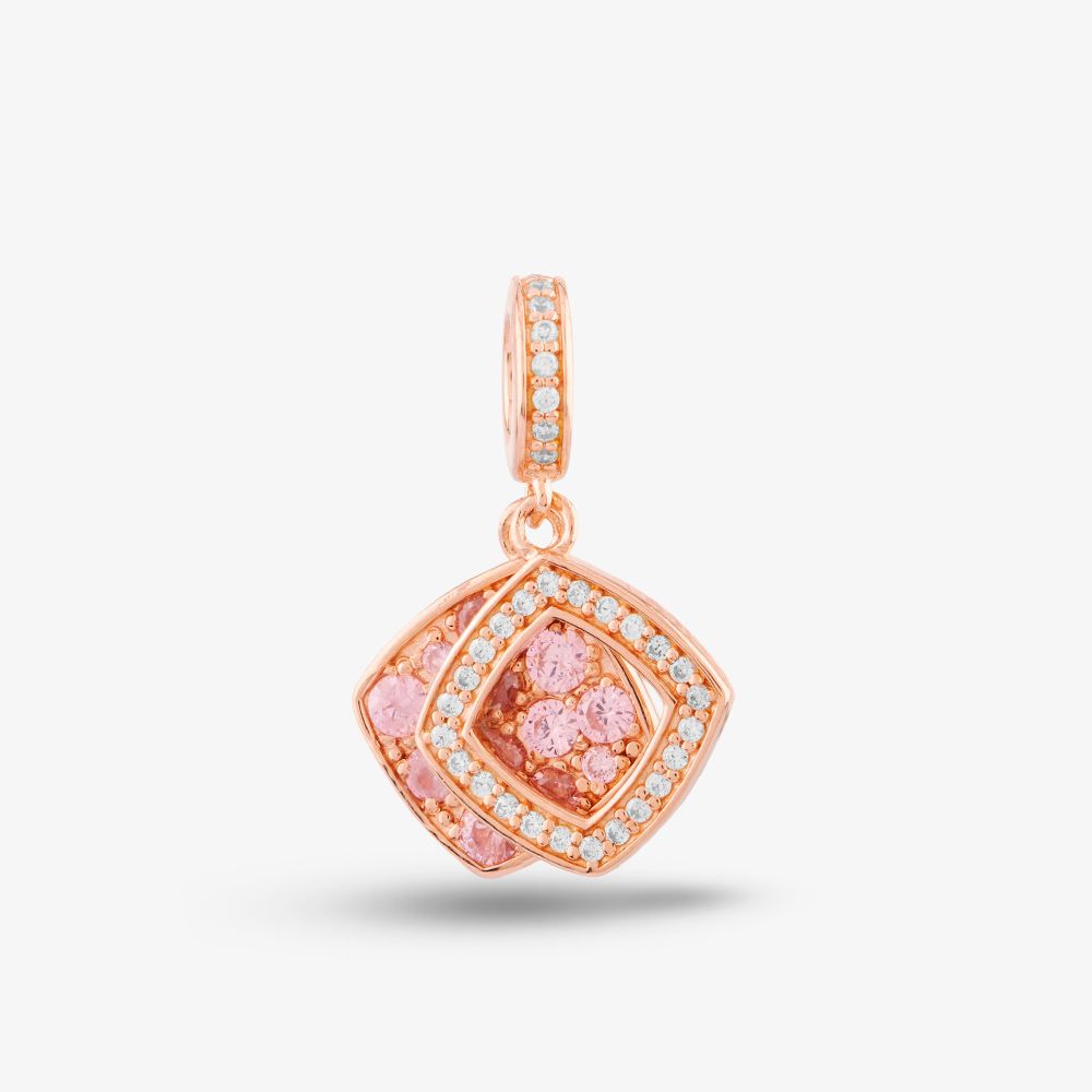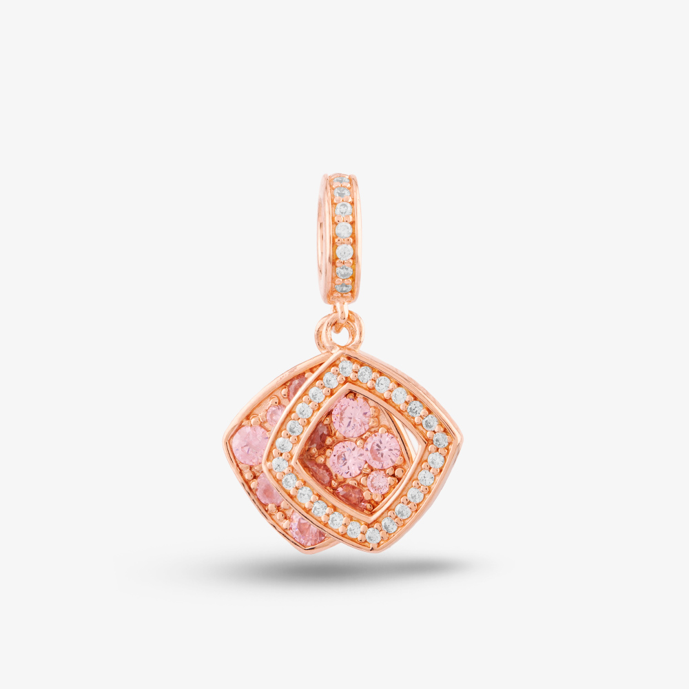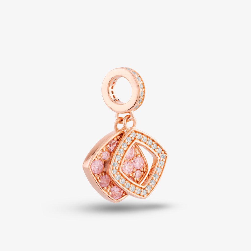 Rosa Lea Rose Gold-Plated 2 Square Dangle Charm AM-THB032206 is crafted from sterling silver with rose gold plating. This double dangle charm includes a back square decorated with pink cubic zirconia stones in various sizes, set in four claws. Another square is featured on top of the back square, including multiple clear cubic zirconia stones for added contrast.