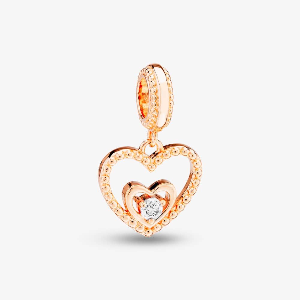 Rosa Lea openwork love heart dangle charm made from rose gold plated sterling silver with a smaller love heart inside and a white cubic zirconia stone set in three claws representing April’s birthstone colour.