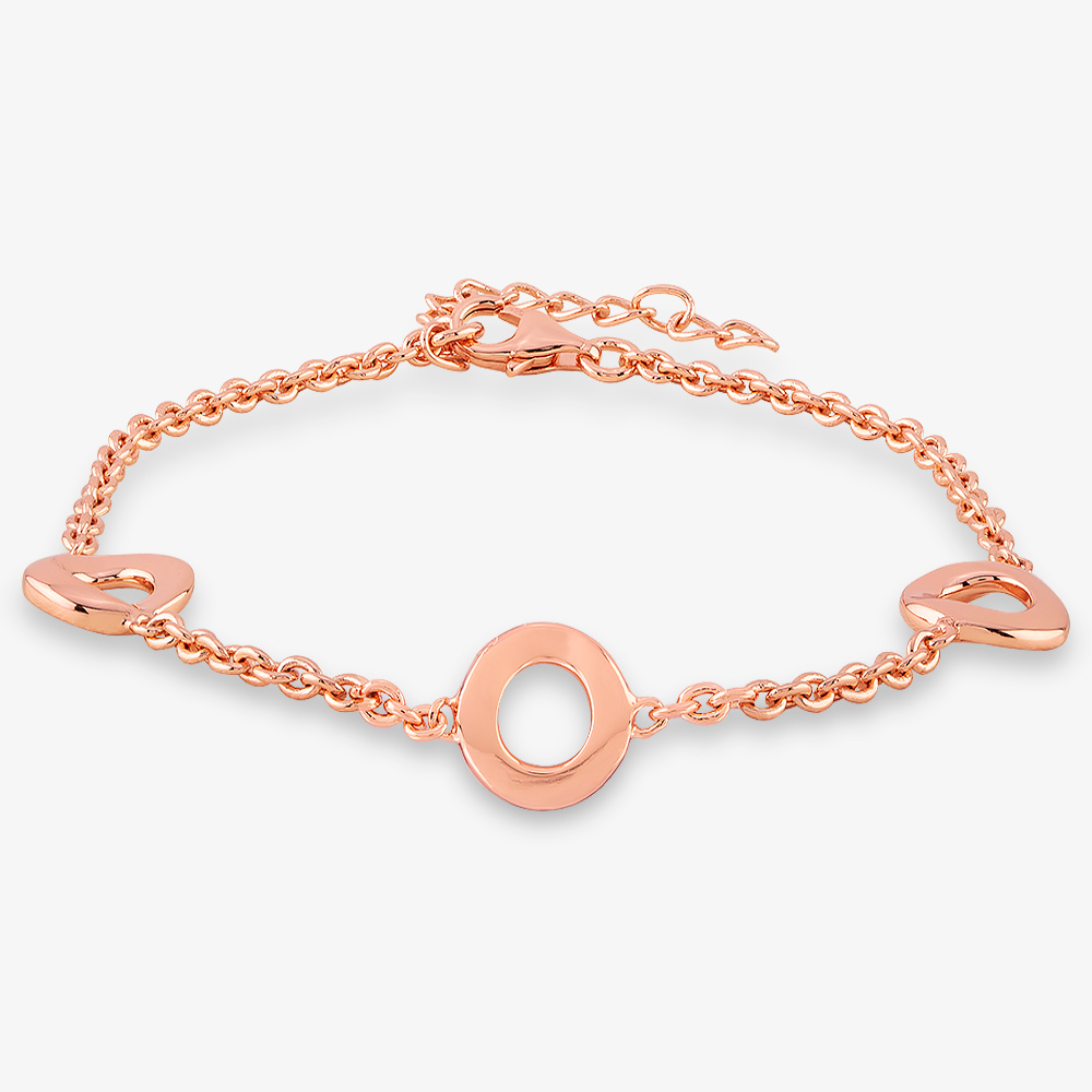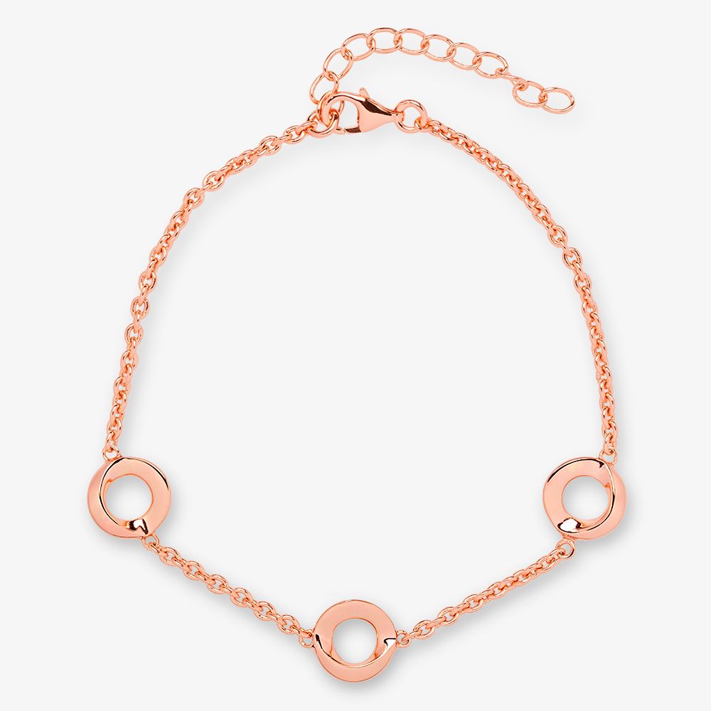 Adorn your outfit with this delightful Rose Gold Plated ladies bracelet from Rosa Lea. Consisting of three individually set open circles which rest in the rose chain. Complete with an easy fasten lobster clasp and extender chain.