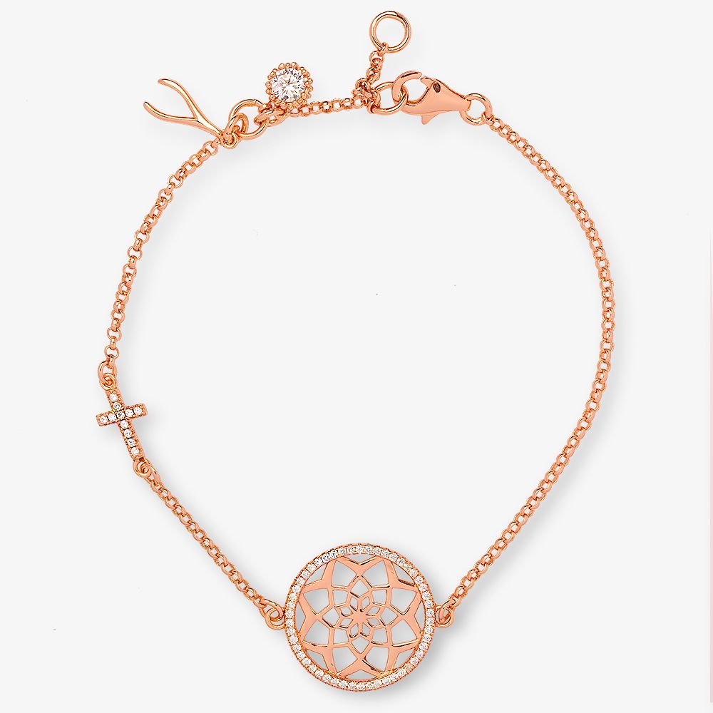 In various spiritual traditions, mandalas may be employed as an aid to meditation and trance induction. This beautifully crafted floral bracelet is no exception, issuing a sense of calm and wonderment from the beautiful geometric pattern. A cubic zirconia halo completes the mandala with a beautiful sheen, whilst an incorporated cross and a wishbone charm add that extra touch of intrigue.