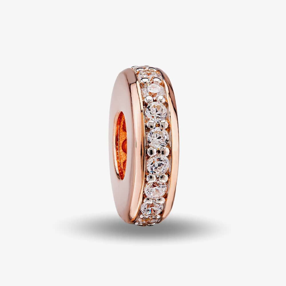 Rosa Lea spacer charm made from sterling silver and plated in rose gold set with white cubic zirconia stones in a line down its centre.