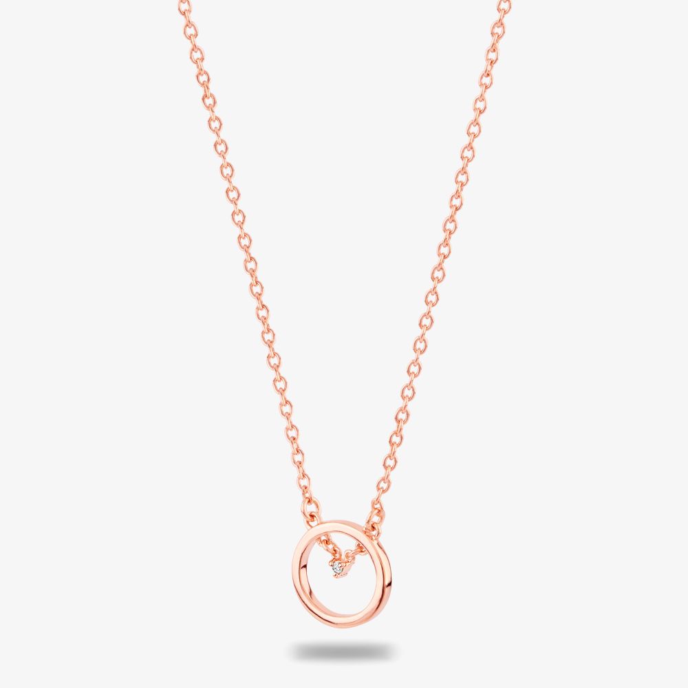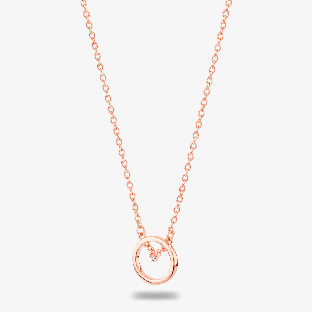 The Centrepiece design showcases a suspended diamond within a thick round bezel, held in place with a delicate trace chain. Elegant and stylish, in this piece the Centrepoint emblem is itself suspended via more trace chain to create the necklet.
