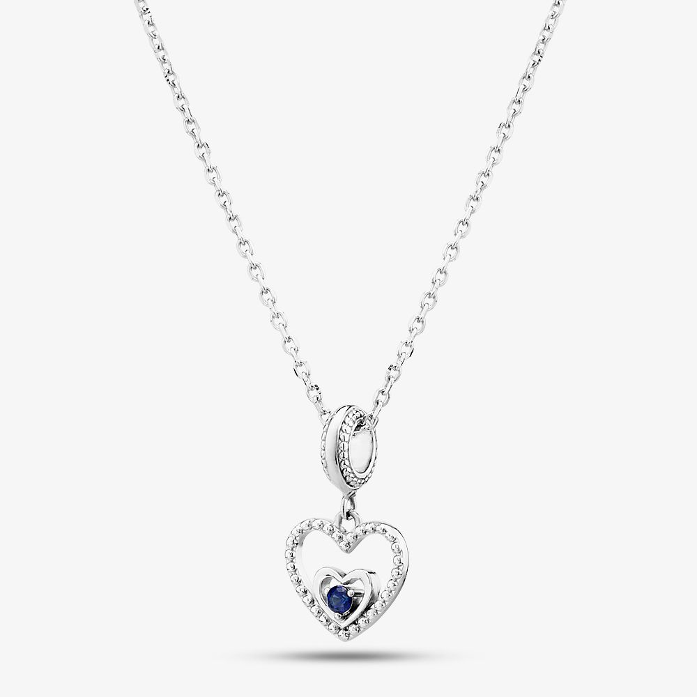 Rosa Lea openwork love heart dangle charm made from sterling silver with a smaller love heart inside and a dark blue cubic zirconia stone set in three claws representing September’s birthstone colour. This charm comes with a fine silver belcher chain measuring 18 inches long and weighing 2.3 grams.