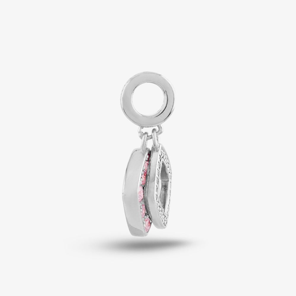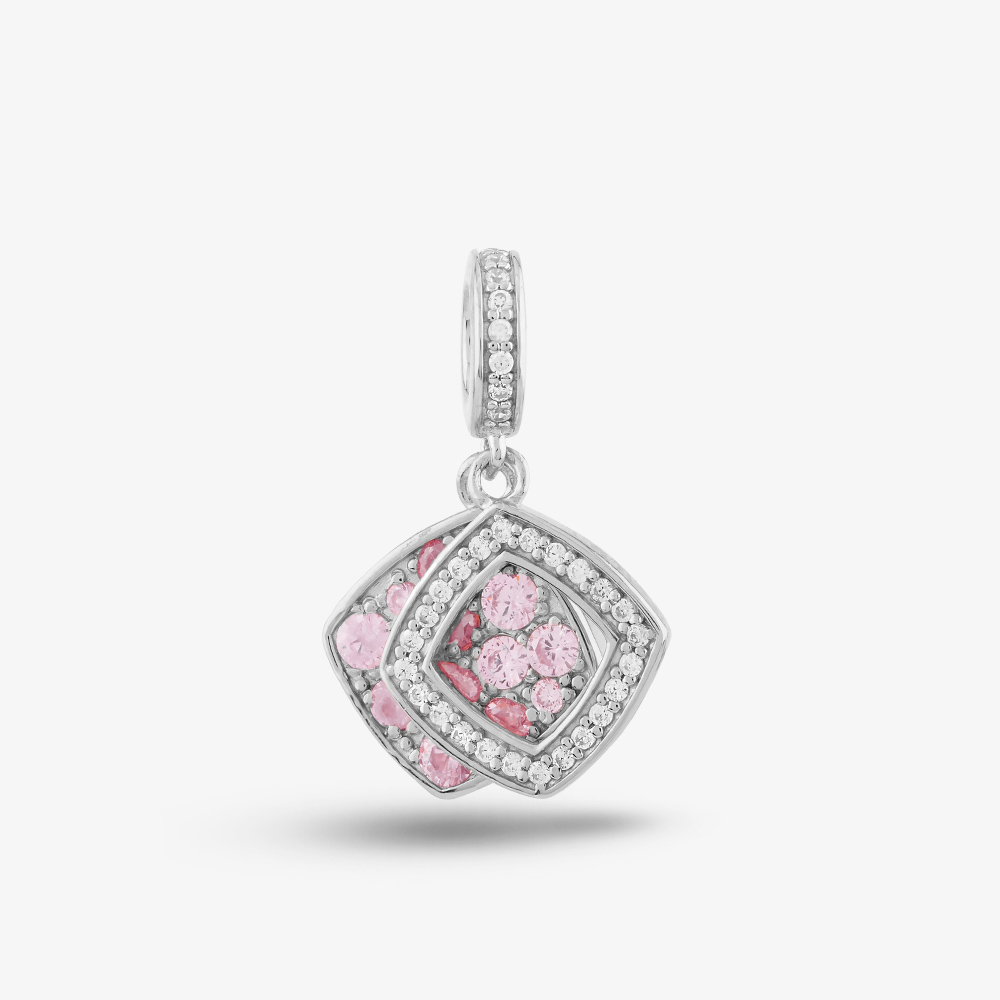 Rosa Lea Silver 2 Square Dangle Charm AM-THB032204 is crafted from sterling silver. This double dangle charm includes a back square decorated with pink cubic zirconia stones in various sizes, set in four claws. Another square is featured on top of the back square, including multiple clear cubic zirconia stones for added contrast.