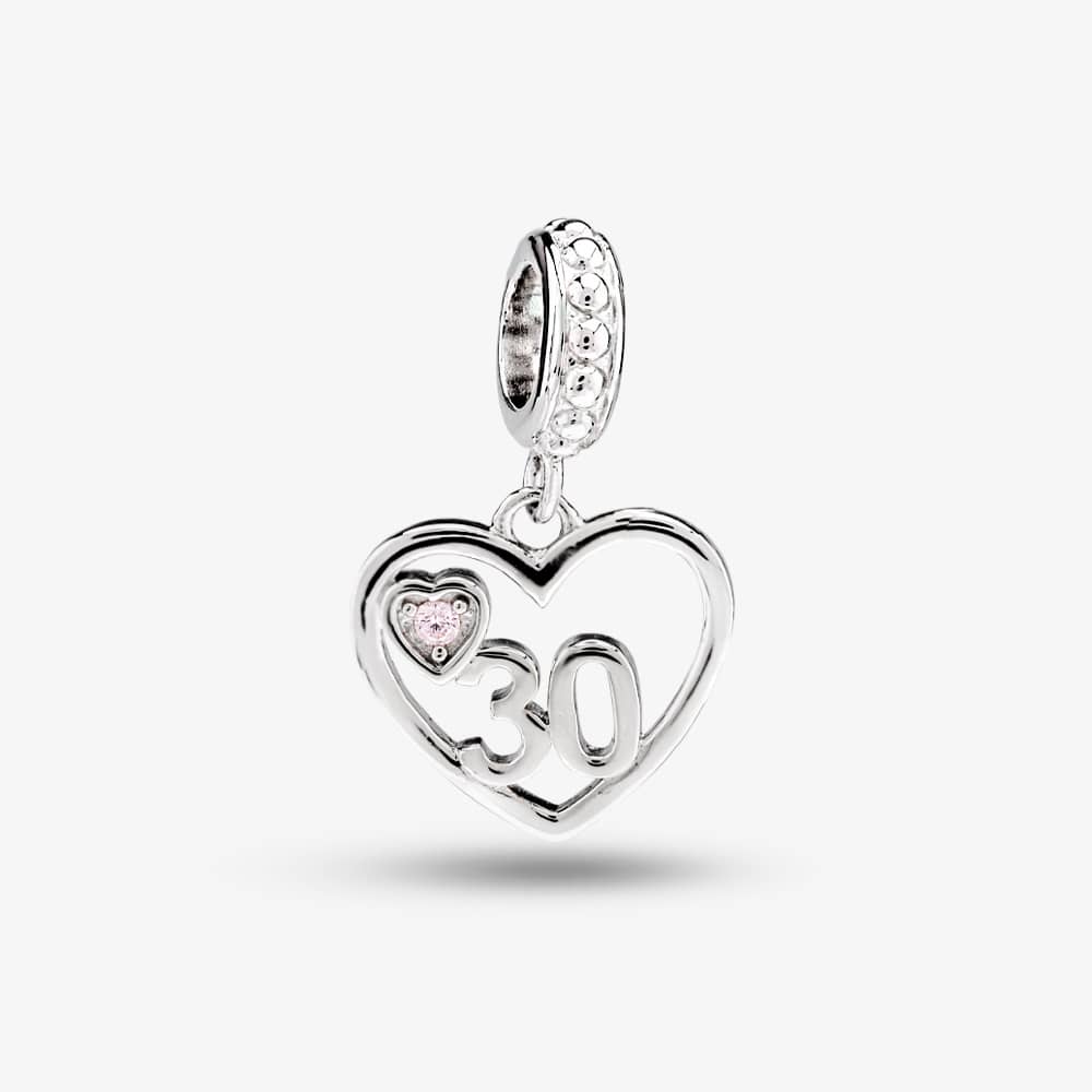 Rosa Lea dangle charm made from sterling silver composed of a love heart with the number 30 and a smaller heart with a pink cubic zirconia set in its centre, perfect for celebrating a significant birthday.
