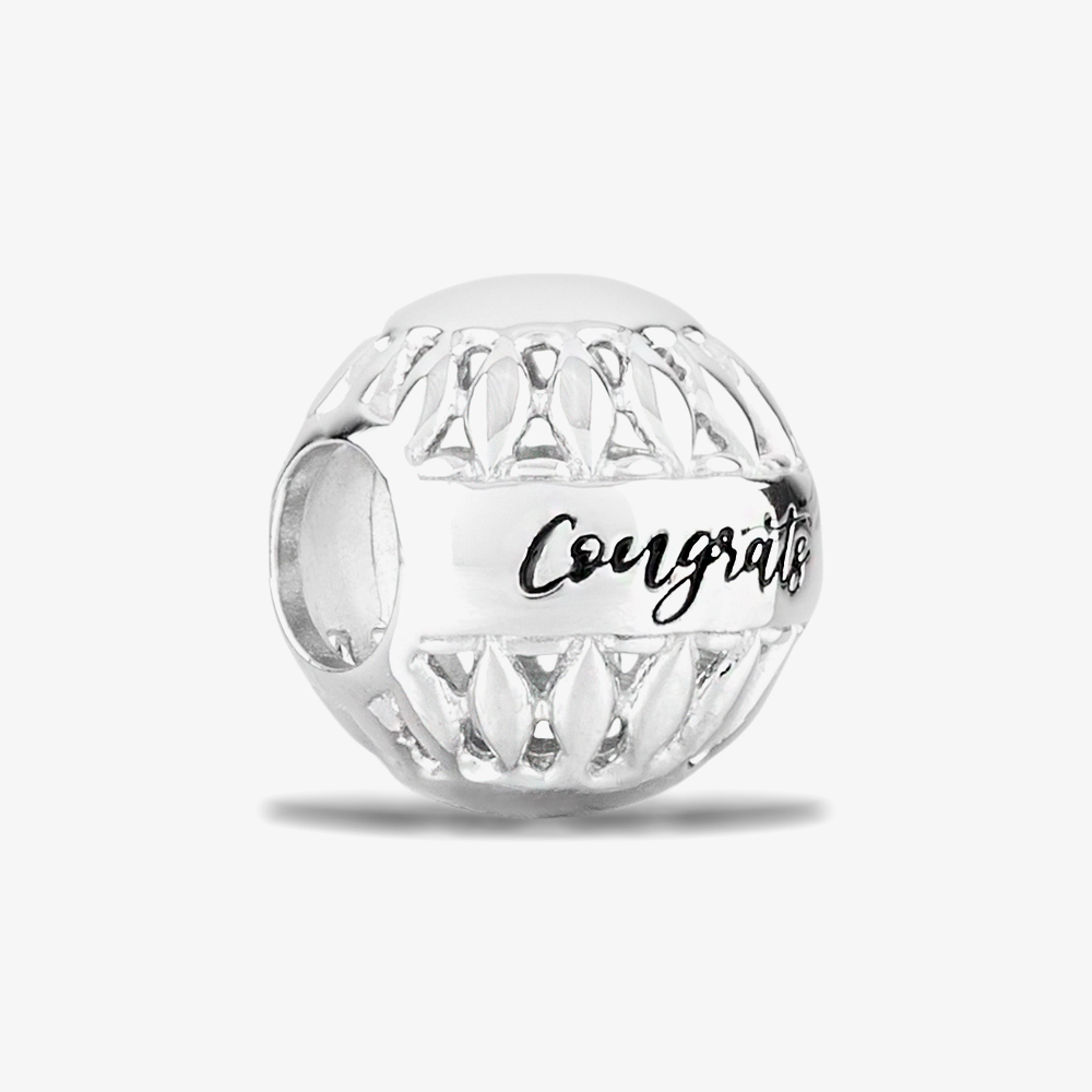 A pretty Rosa Lea charm made from sterling silver composed of a sphere shape and openwork design with the word Congrats in black enamel in the centre.