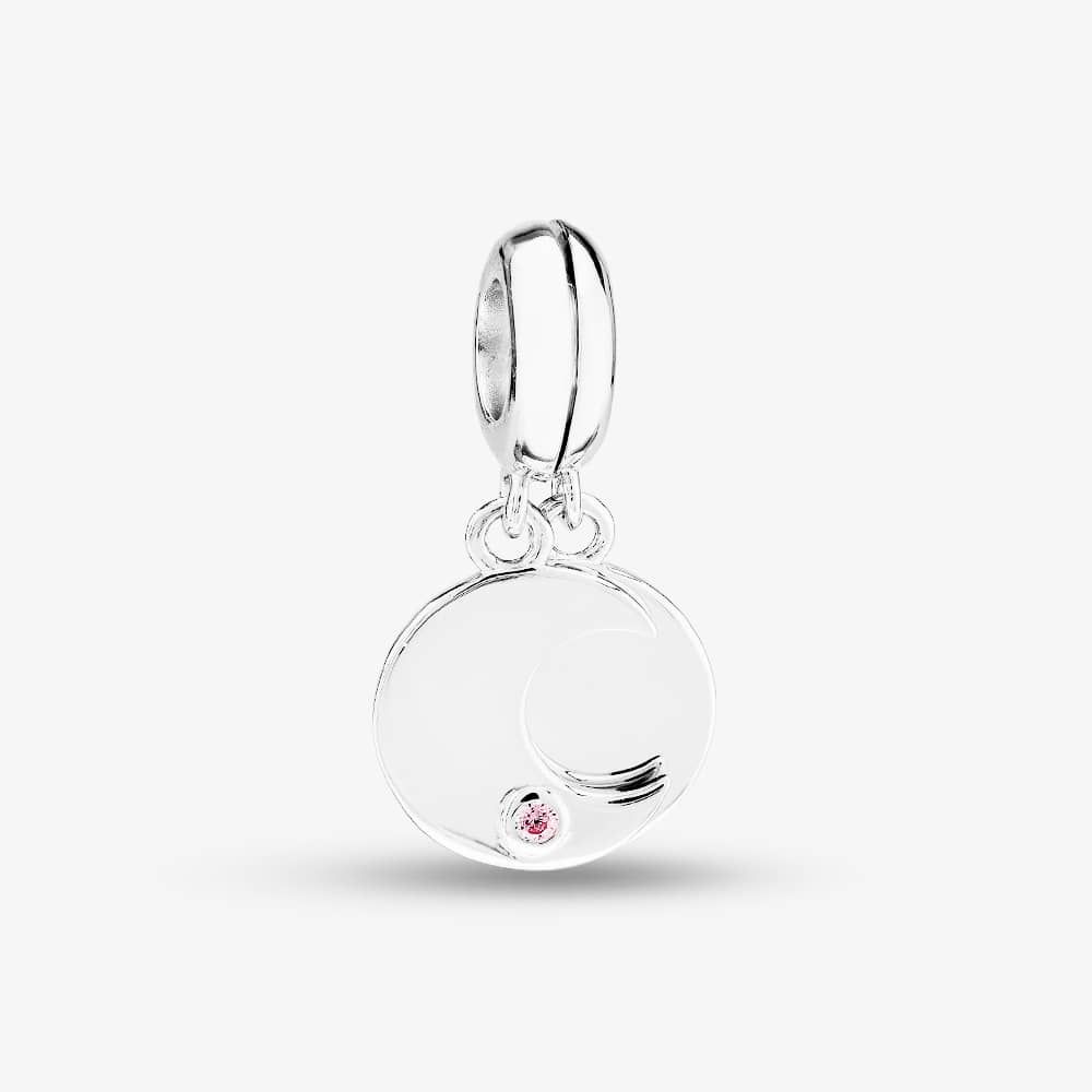 Rosa Lea full and crescent moon double dangle charm made from sterling silver and set with a pink cubic zirconia stone. It is also composed of two pieces which can be worn together or separately.