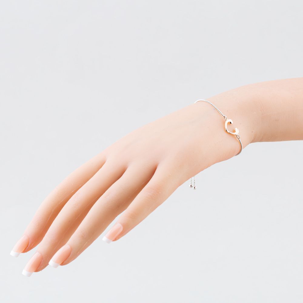 A pretty Rosa Lea bracelet with an adjustable sliding clasp. The belcher chain bracelet is made from sterling silver and measures 24cm long with an incomplete rose gold plated heart set with cubic zirconia stones at each end.