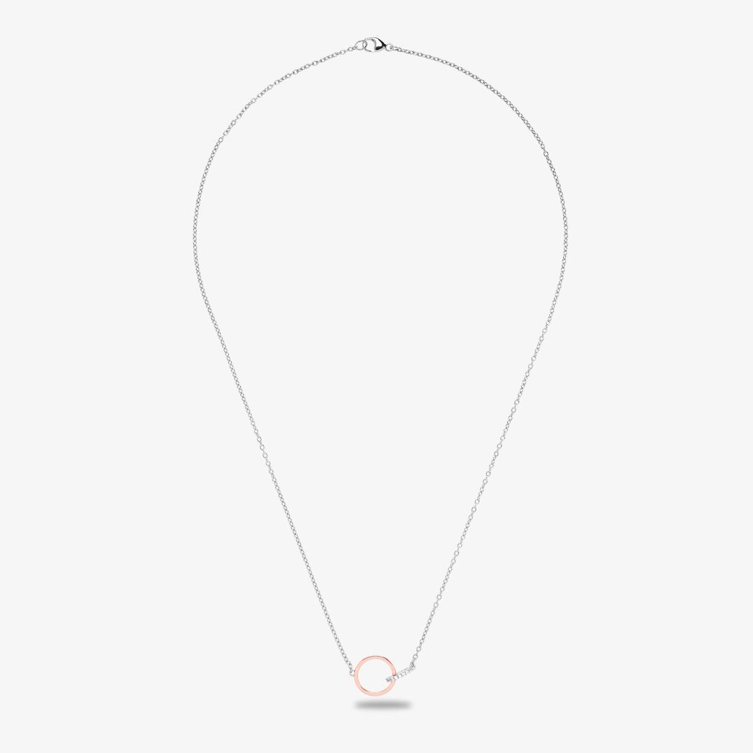 An elegant Rosa Lea necklace measuring 50cm long made from sterling silver. The design is composed of a belcher chain with two joined circles forming the centrepiece. The sterling silver circle is set with clear cubic zirconia stones and the second circle is plated with rose gold.
