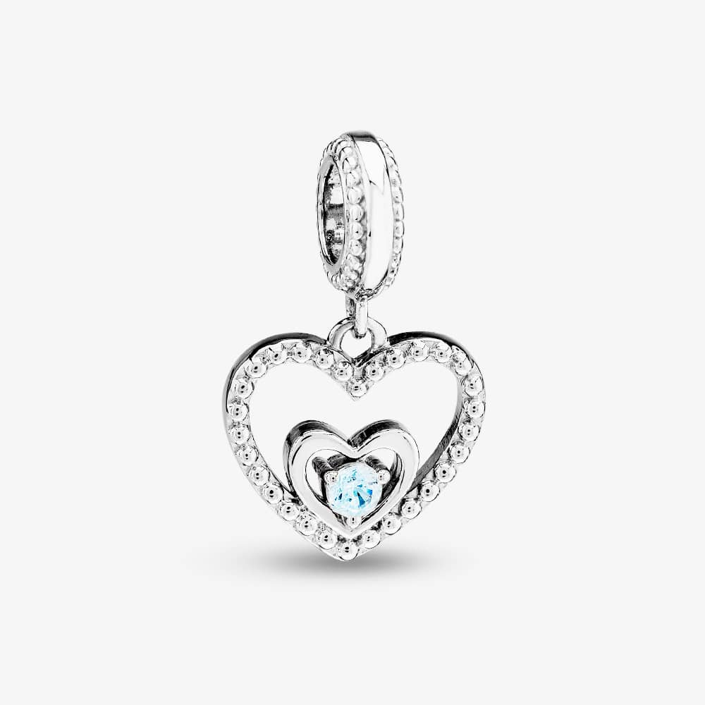 Rosa Lea openwork love heart dangle charm made from sterling silver with a smaller love heart inside and a light blue cubic zirconia stone set in three claws representing March’s birthstone colour.