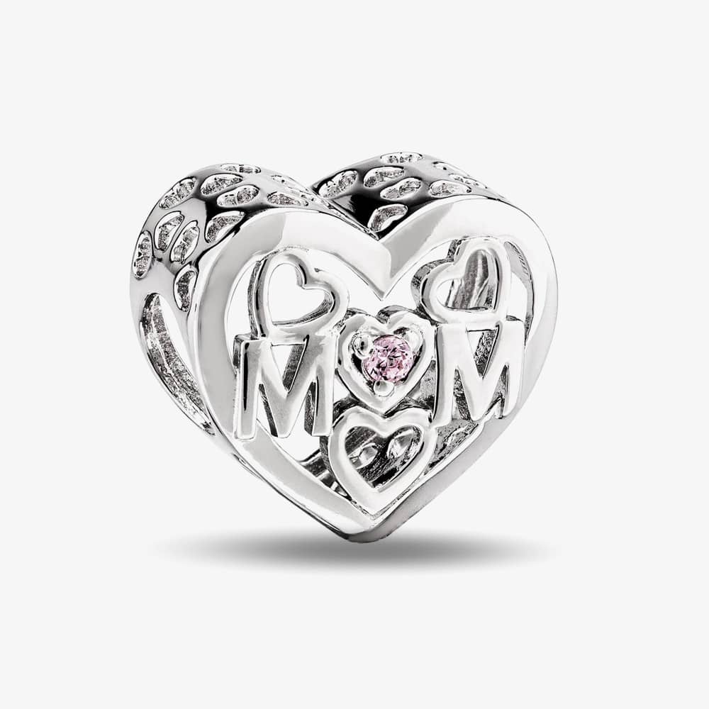 Rosa Lea heart shaped bead charm made from sterling silver. This charm has openwork detailing including love hearts along the sides and M♥M in the middle with a pink cubic zirconia stone set in the centre.