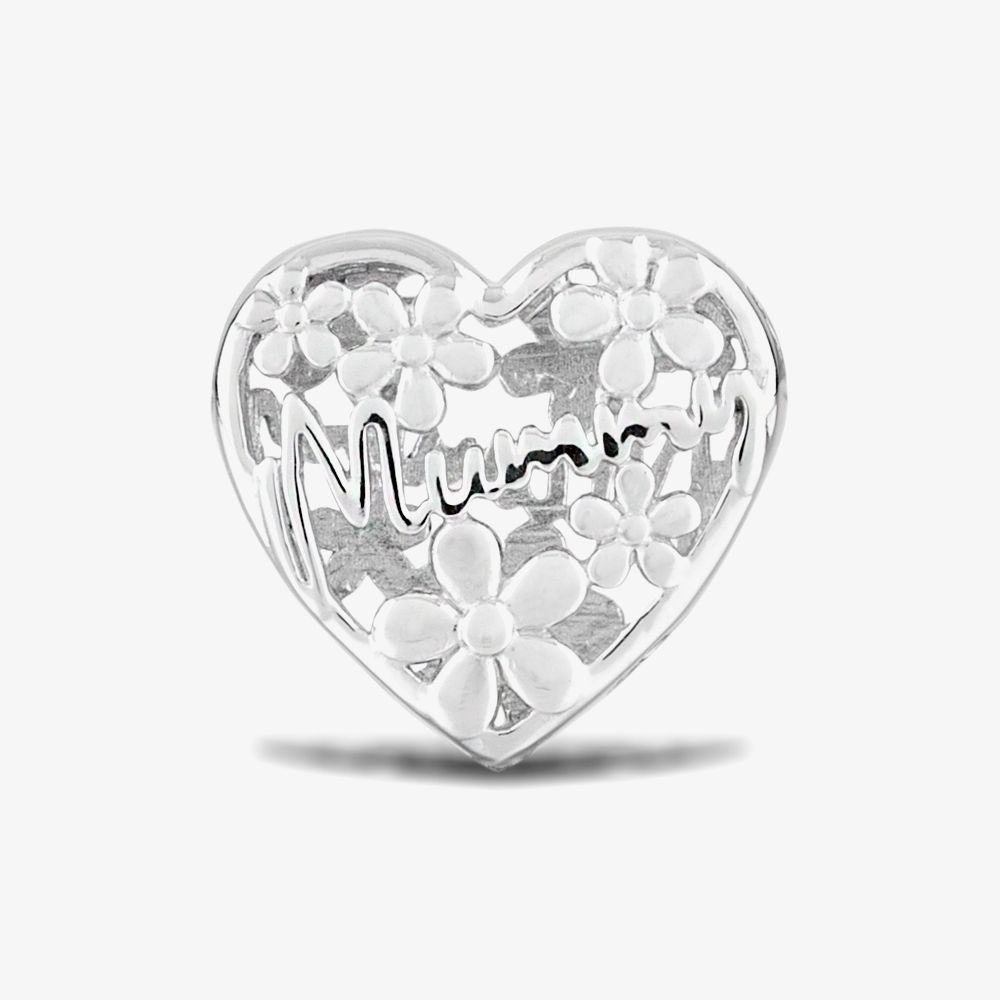A pretty Rosa Lea charm made from sterling silver composed of a heart shape and openwork design with flowers and the word Mummy in the centre.