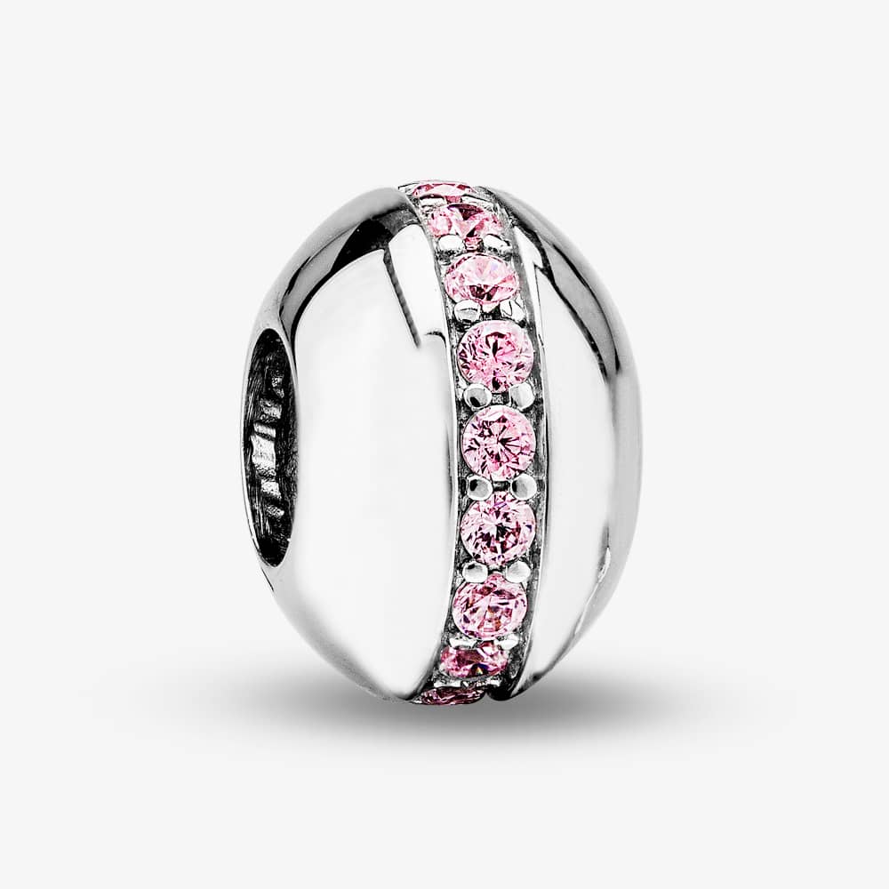 Rosa Lea round shaped charm made from sterling silver and set with pink cubic zirconia stones in a line down its centre.