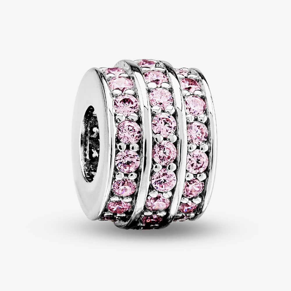Rosa Lea barrel charm made from sterling silver and set with three rows of pink cubic zirconia stones.