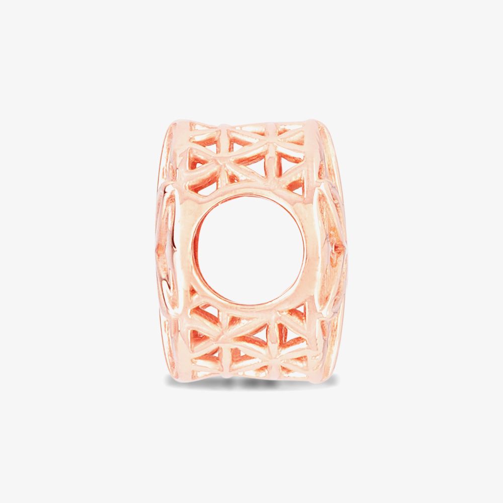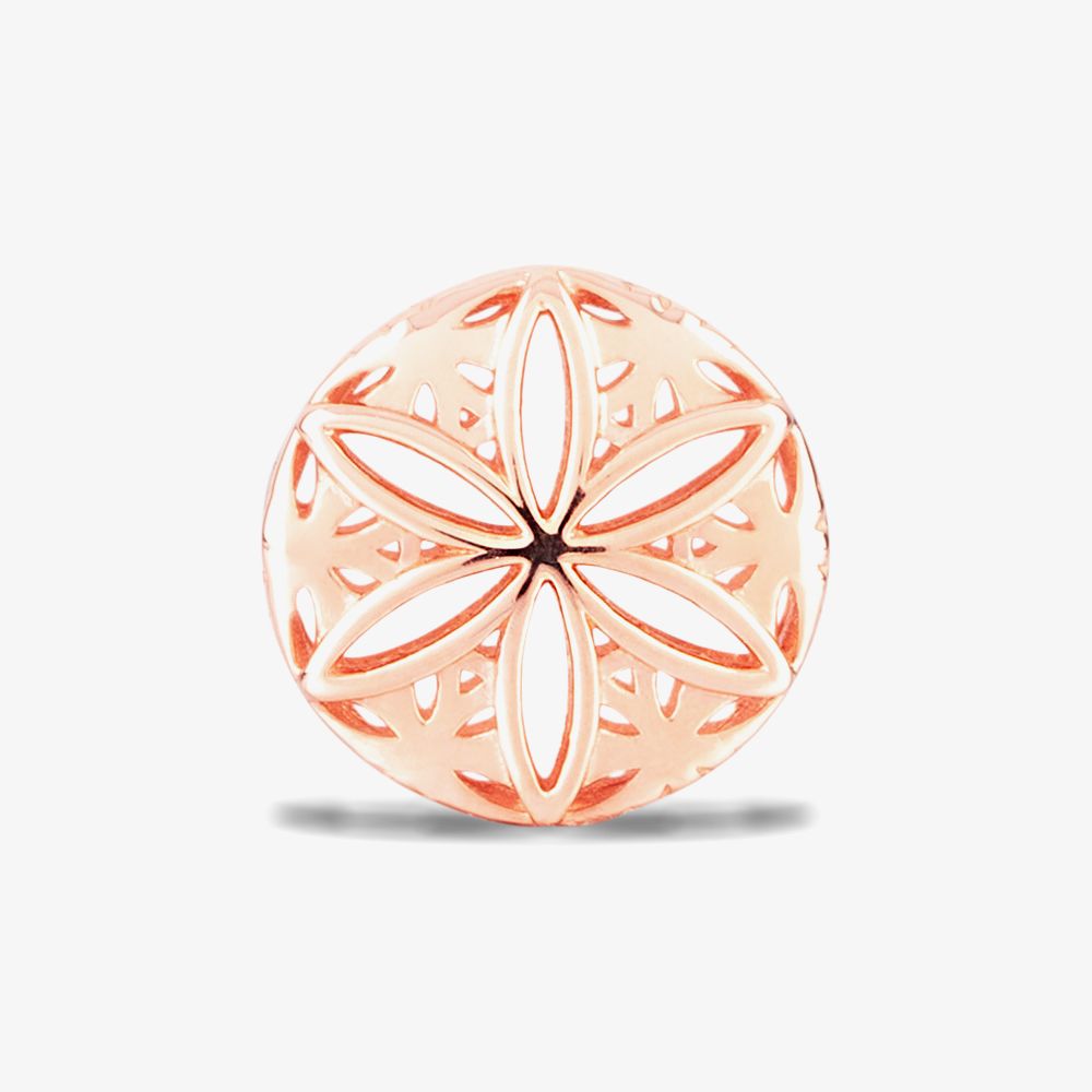 A pretty Rosa Lea charm made from sterling silver composed of a rounded shape with an openwork symmetrical flower in the centre and a beaded pattern along the sides.