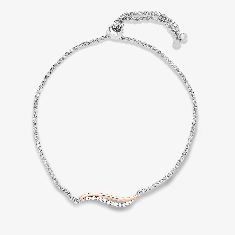 A gorgeous Rosa Lea bracelet with an adjustable sliding clasp. The belcher chain bracelet is made from sterling silver and has a wave centrepiece. The sterling silver wave is set with clear cubic zirconia stones and the second wave is plated with rose gold.