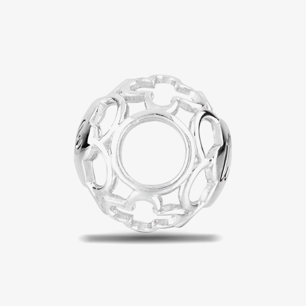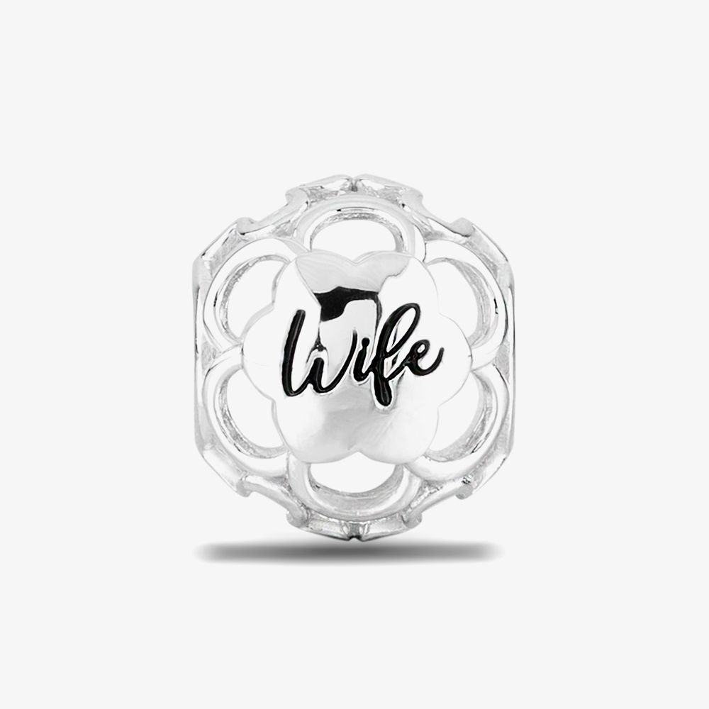 A sentimental Rosa Lea charm made from sterling silver composed of a sphere shape and openwork design with the word Wife in the centre.