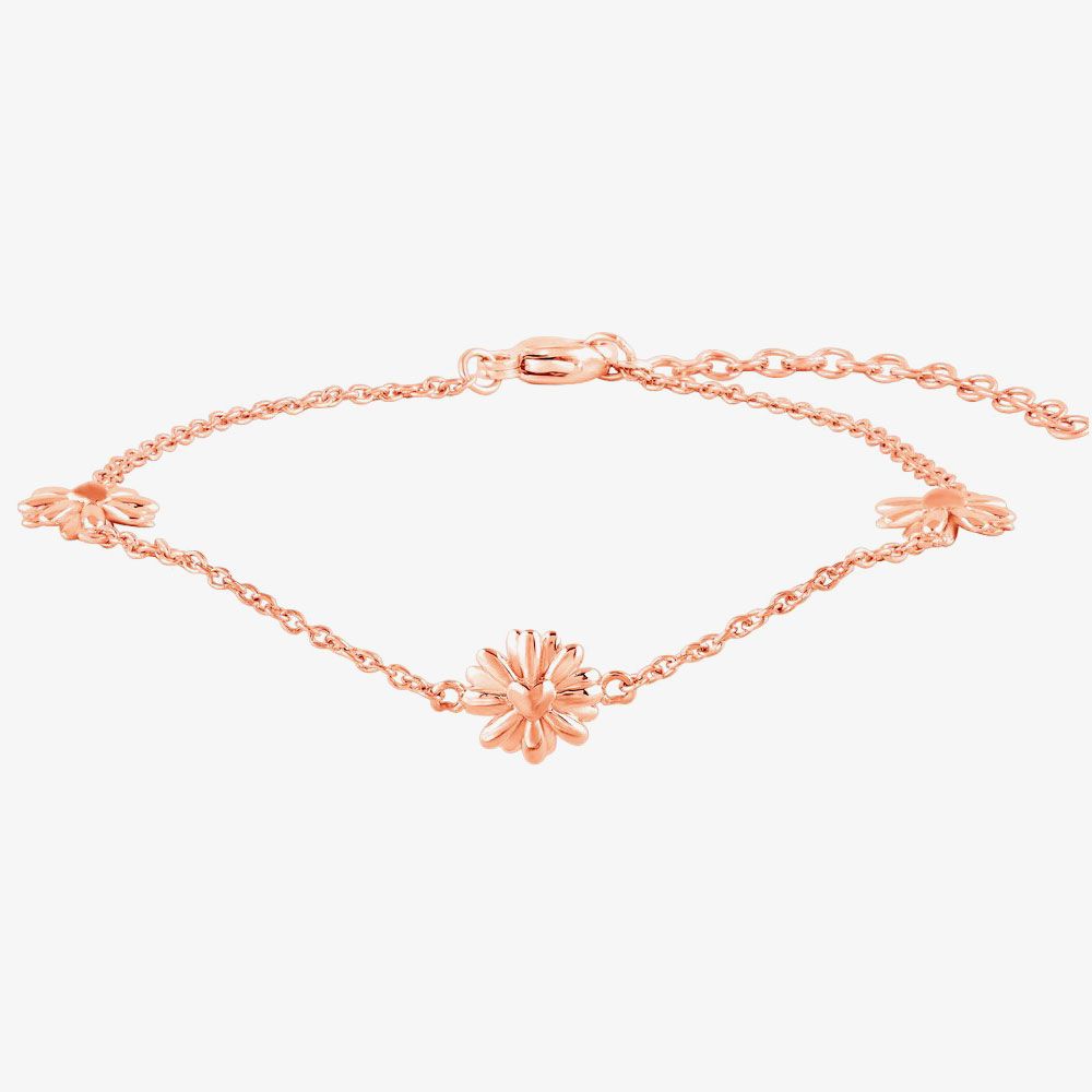 Rosa Lea Ladies Triple Rose Gold Plated Daisy Bracelet. This elegant bracelet is crafted from sterling silver with an adjustable chain, measuring from 16cm - 20cm. The bracelet features 3 sterling silver daisies each with a rose gold-plated heart-shaped centre, creating this simple yet beautiful bracelet.