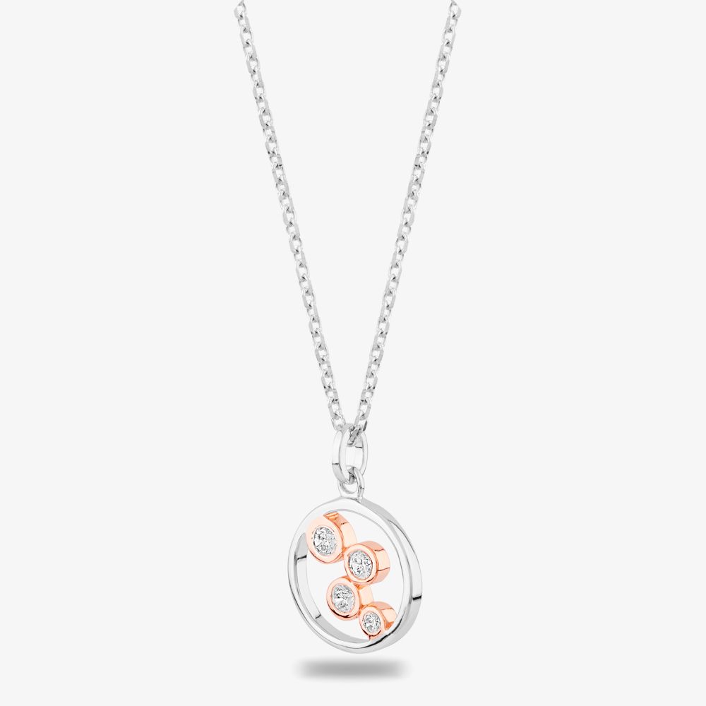 The fun and flirty Bubble Ring design from the Rosa Lea AW18 collection is compromised of four graduated cubic zirconia encased in chunky connected rose gold-plated bezels, enveloped in a shimmering sterling silver 'bubble'.