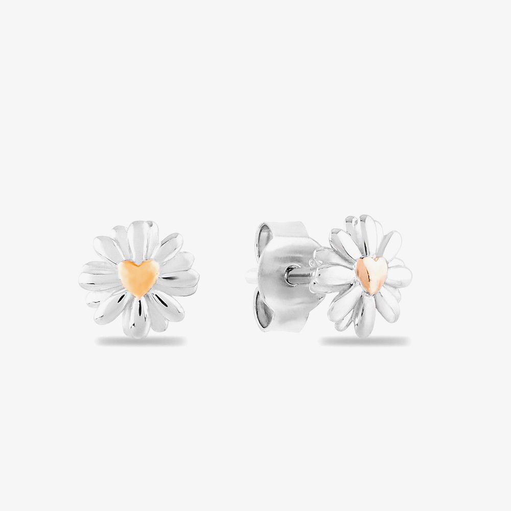 This set includes a sterling silver necklace with a daisy motif with a Rose Gold Plated heart centre and sterling silver daisy shaped stud earrings with Rose Gold Plated heart centres.
