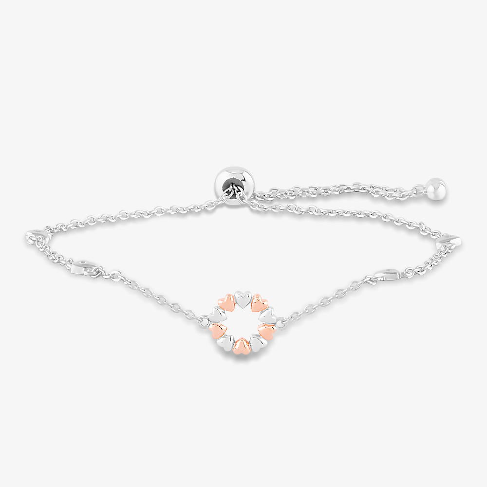 The Rosa Lea Two Tone Heart Toggle Bracelet AM-THB031706 features an alternating sterling silver tone and Rose Gold Plated heart open circle motif. This beautiful sterling silver bracelet is completed with an adjustable toggle fastening.