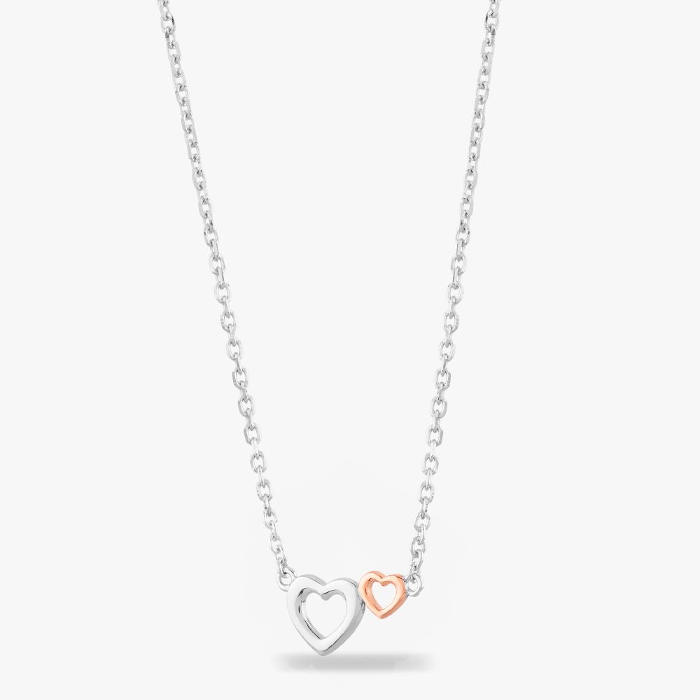 The Rosa Lea Two Tone Open Heart Necklace AM-2THB025006 is created in sterling silver. This beautiful necklace features a two tone double open heart motif, making it a perfect gift for that special someone.