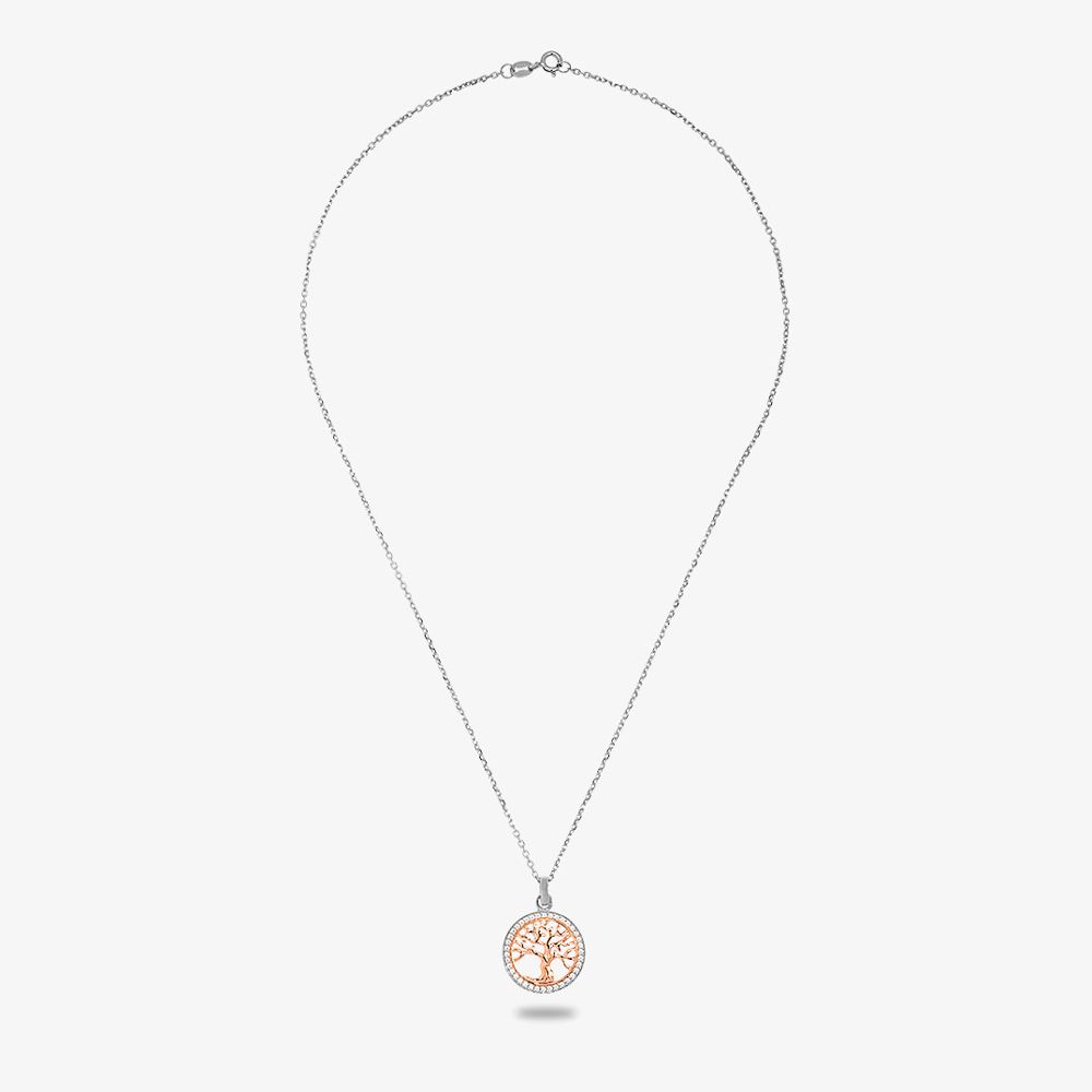 In our Two Tone offering, the rose gold-tone tree is given a high polished shine to contend with the shimmer and sparkle of the sterling silvery stone-set bezel.