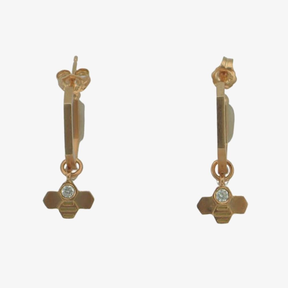 These beautiful rose gold plated earrings feature a hexagonal hoop design with tiny hexagonal shaped bumble bee pendants set with sparkling cubic zirconia.