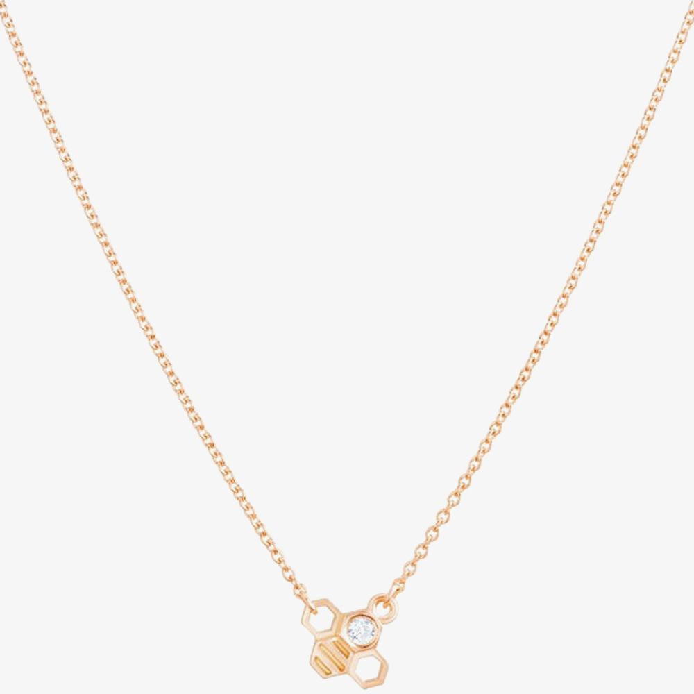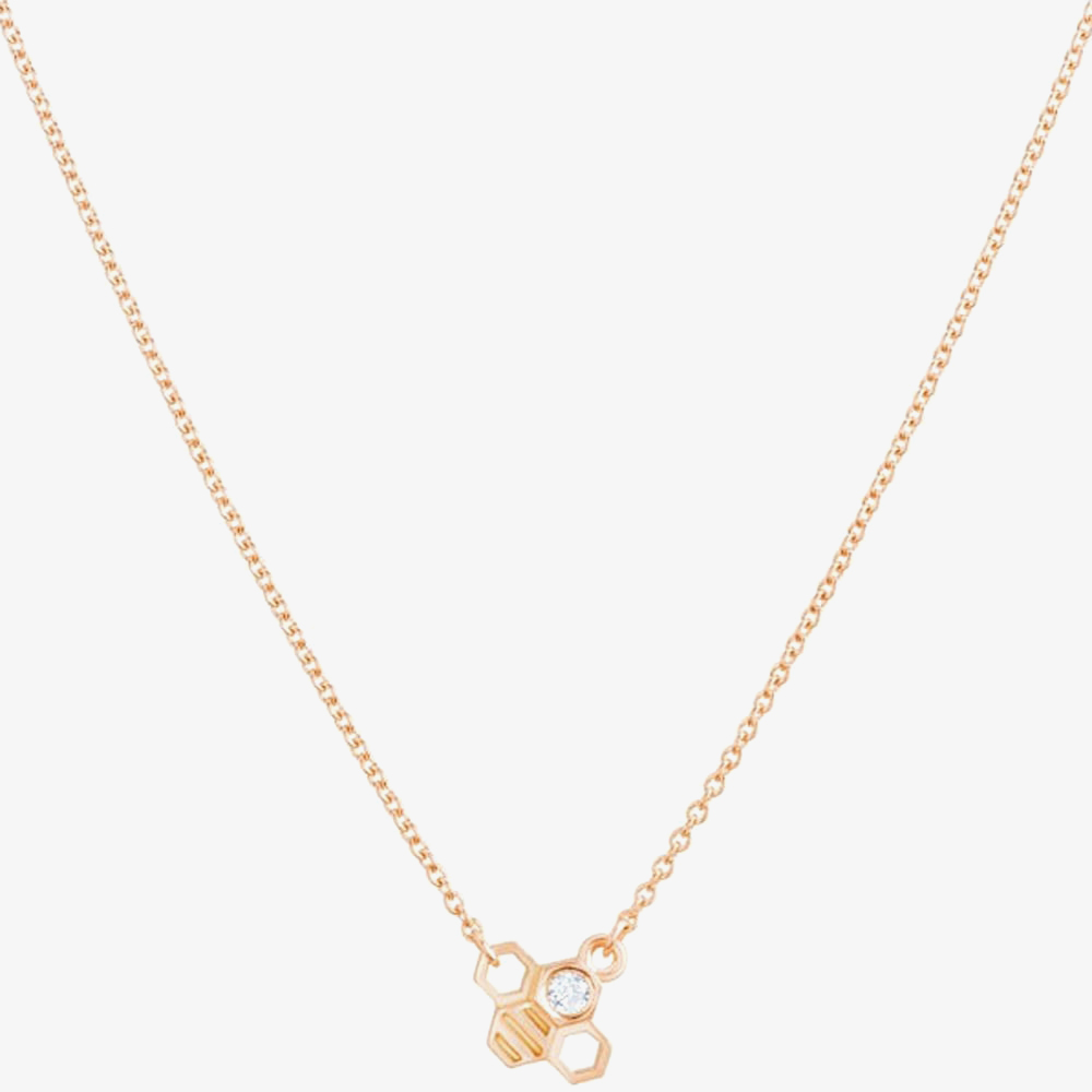 This beautiful rose gold plated necklace features a tiny horizontal hexagonal shaped bumble bee motif which is set with a sparkling cubic zirconia.
