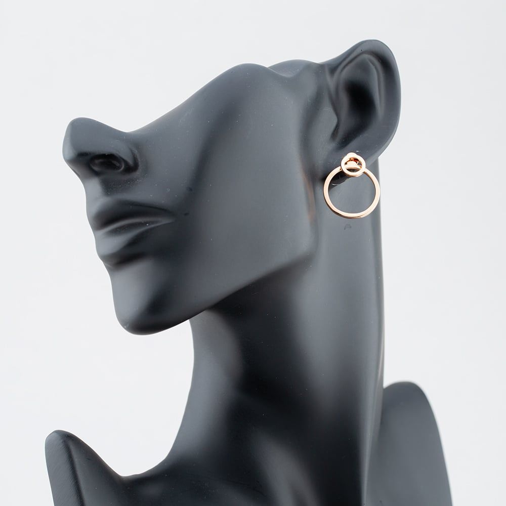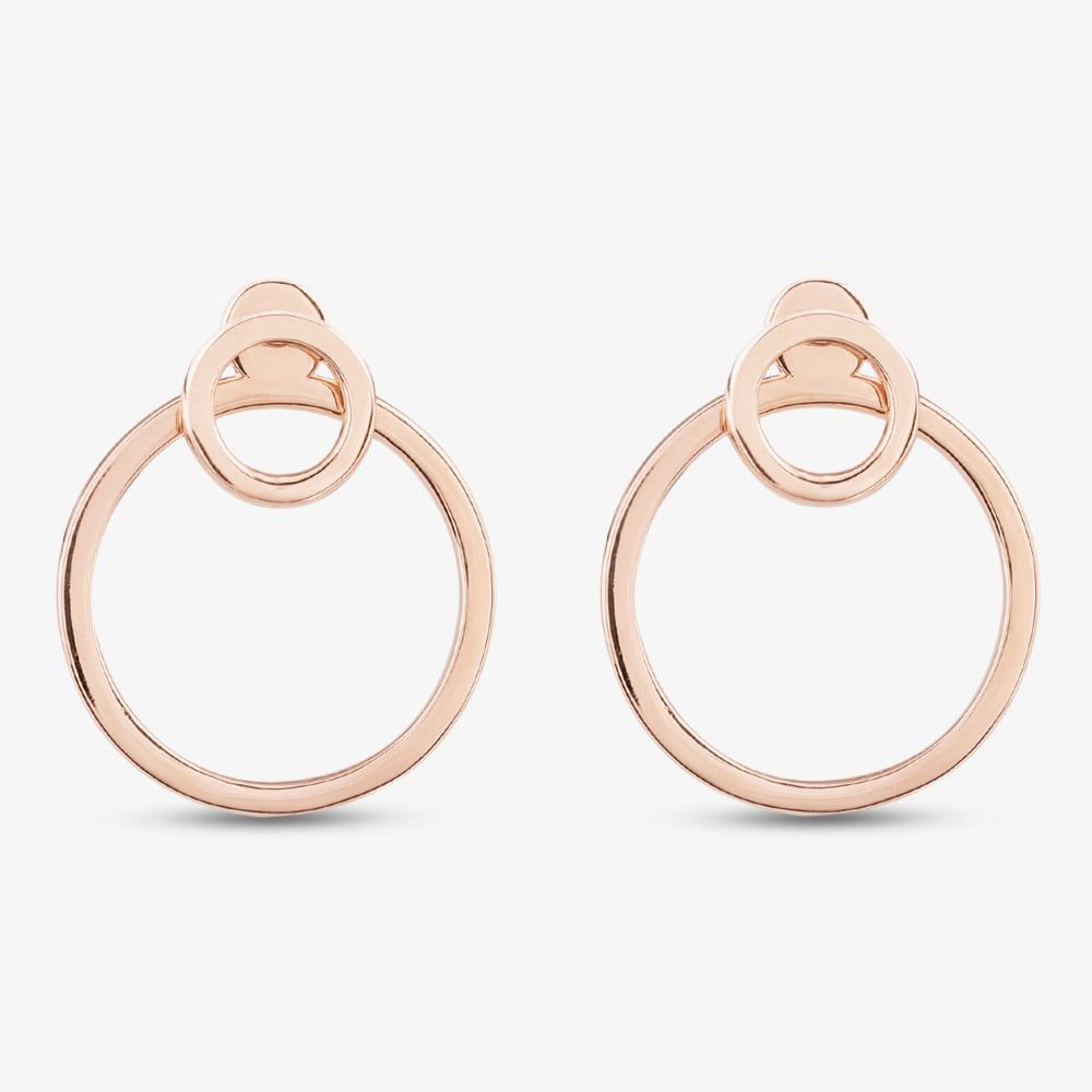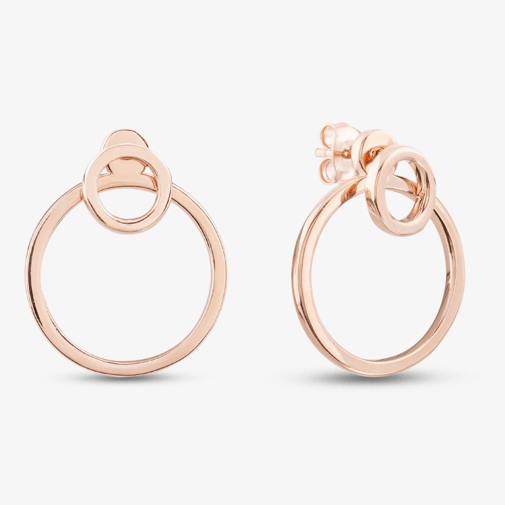 Stylish sterling silver stud earrings with a rose gold-plated finish, featuring a double-circle dropper design that combines modern elegance with timeless charm.