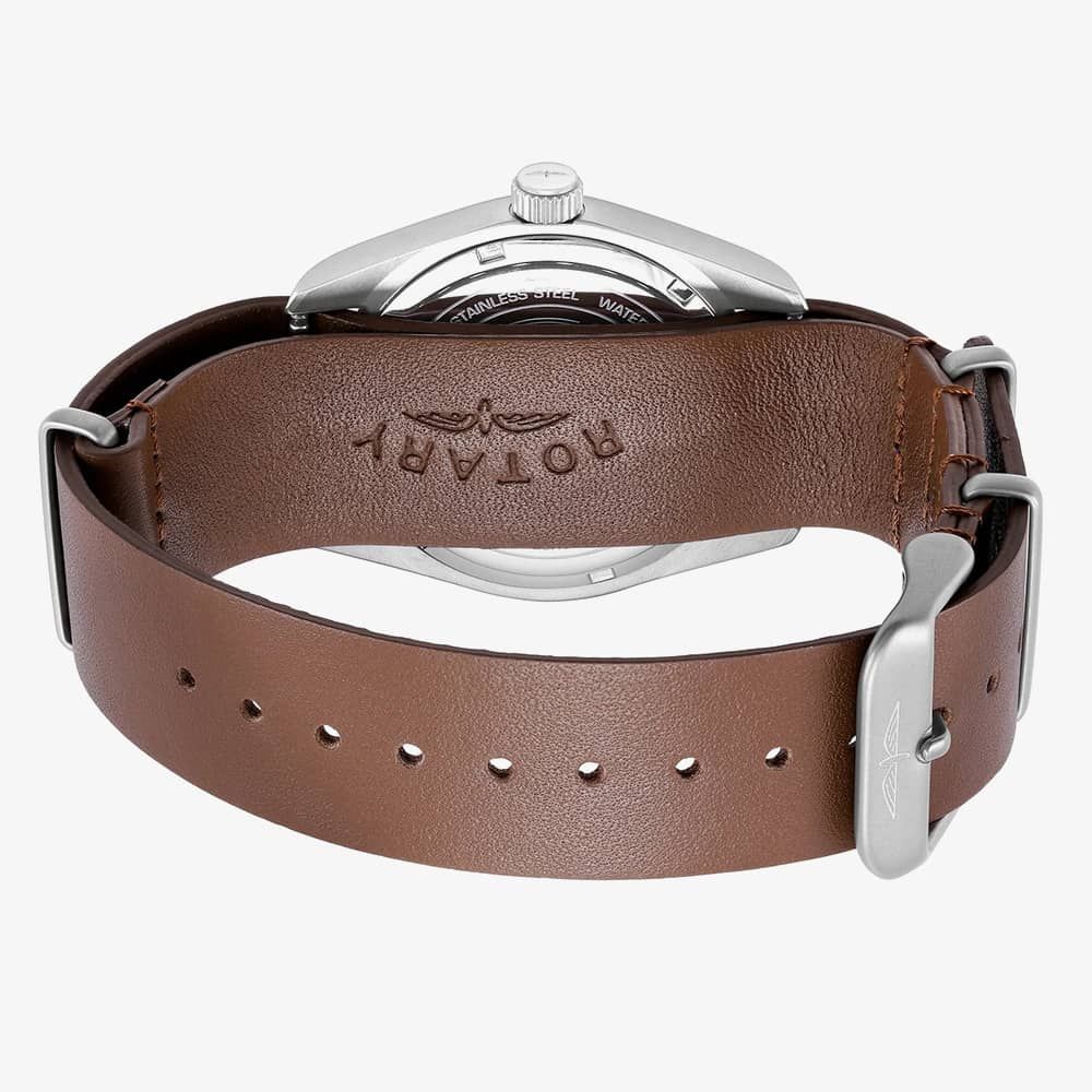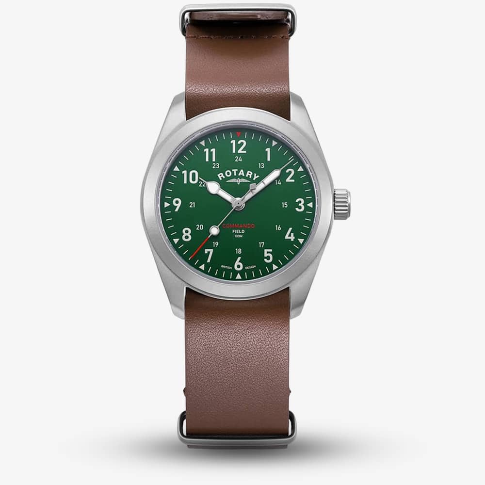 Elevate your wrist with the bold and rugged Rotary Commando watch for men. Its brown leather NATO strap and green dial exude a sense of military-inspired strength and style. This timepiece is perfect for those who appreciate a blend of durability and sleek design.
