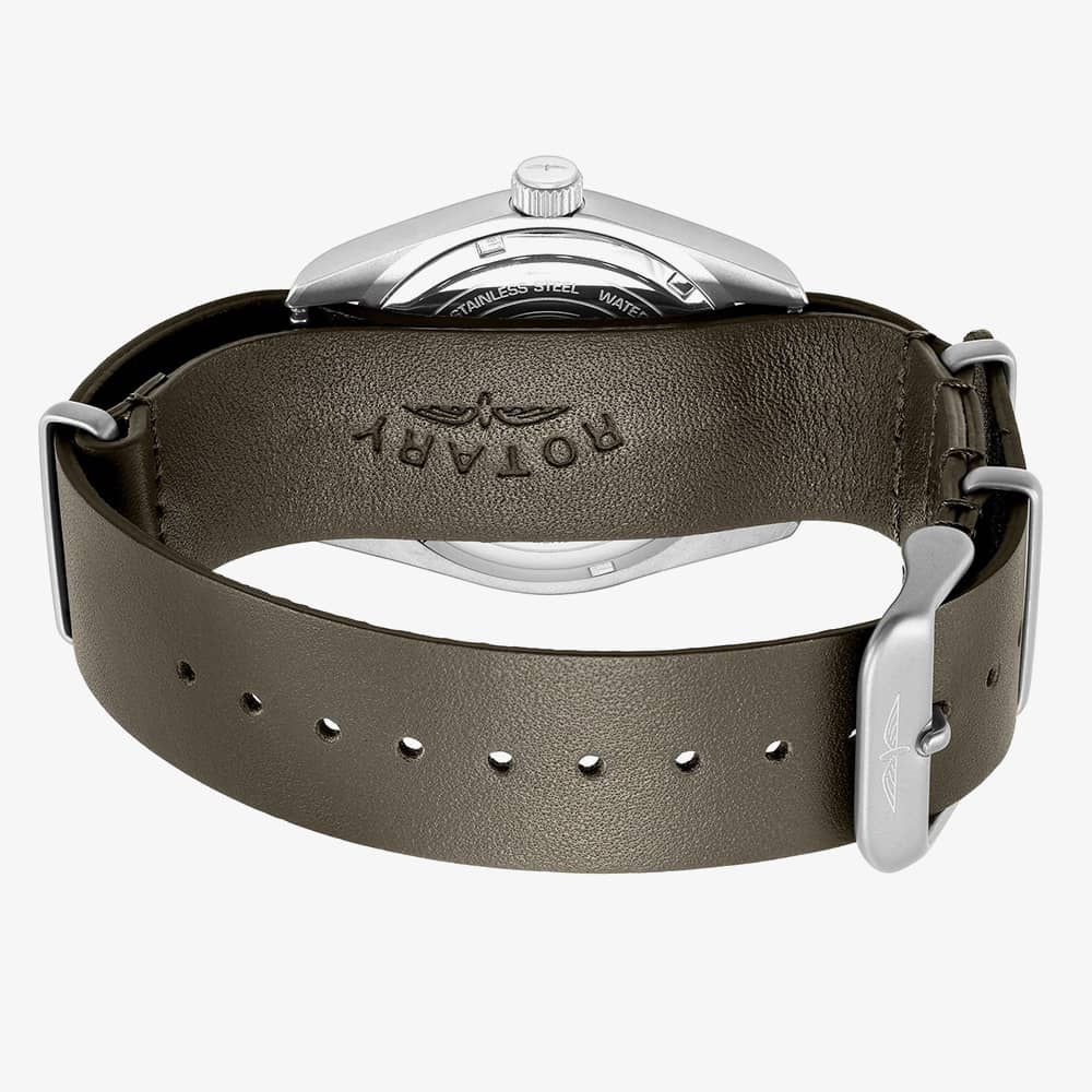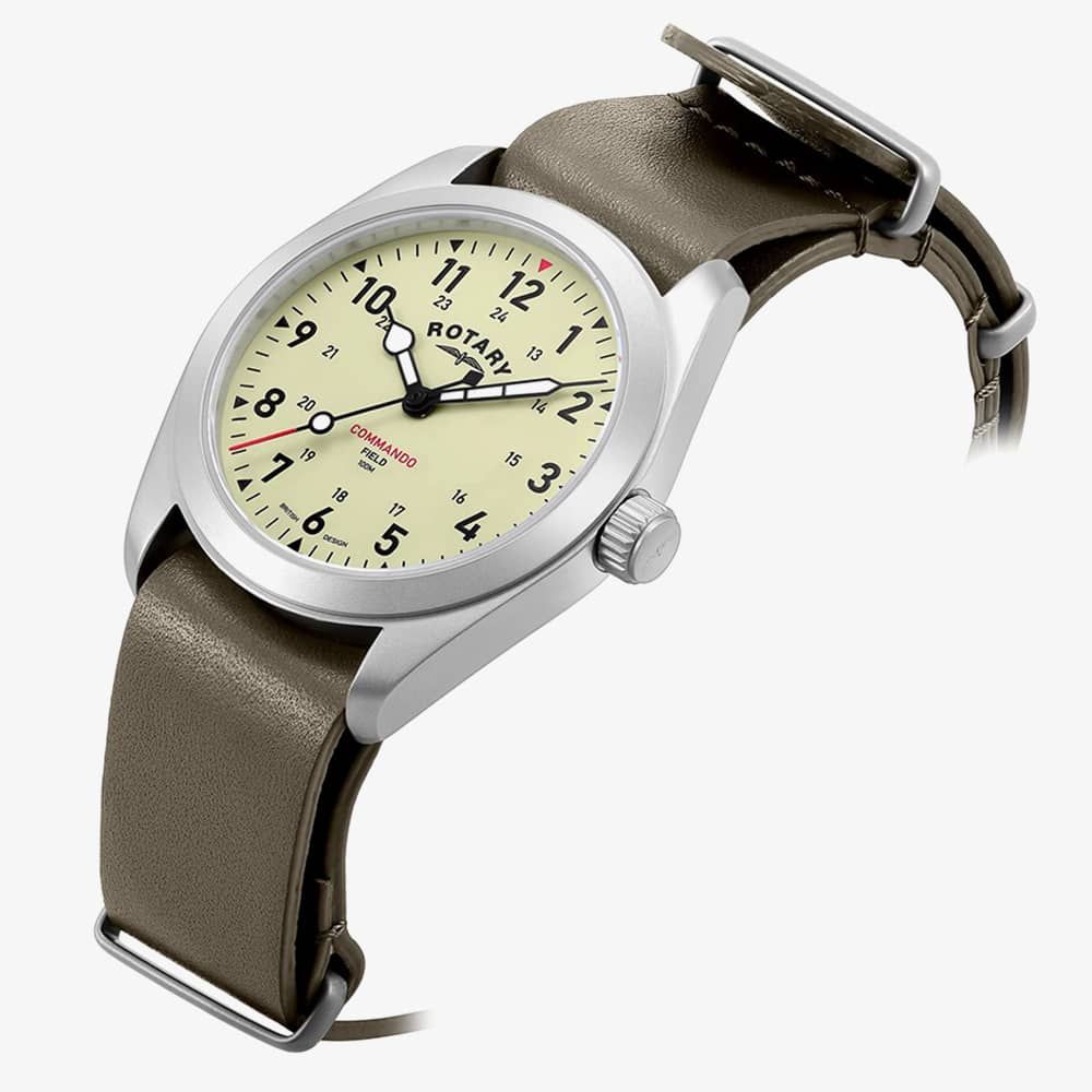 Elevate your wrist with the bold and rugged Rotary Commando watch for men. Its khaki leather NATO strap and cream dial exude a sense of military-inspired strength and style. This timepiece is perfect for those who appreciate a blend of durability and sleek design.