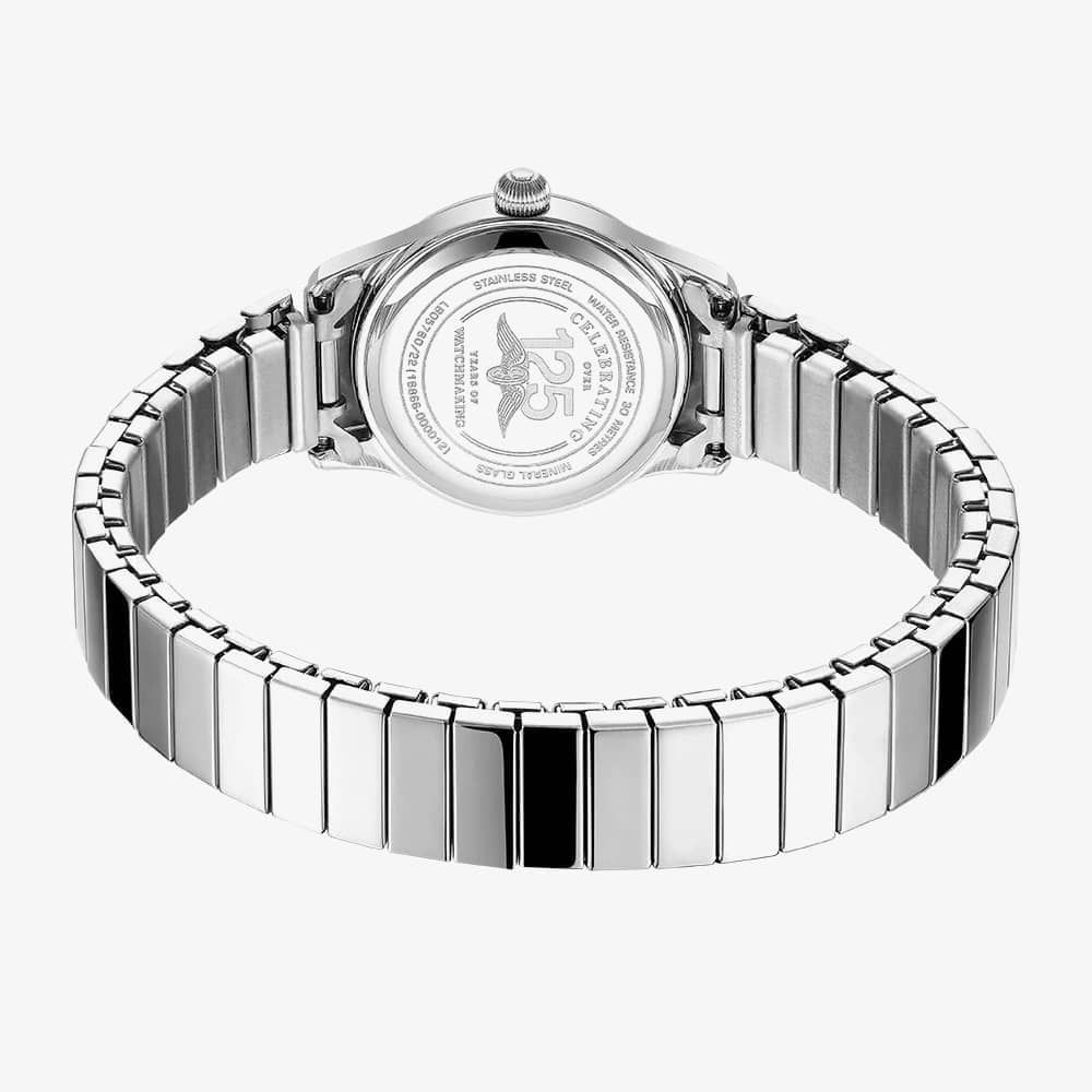 This elegant timepiece seamlessly combines style and comfort. The silver expandable strap provides a perfect fit for any wrist while exuding timeless charm. The watch's silver sunray dial adds a touch of sophistication, catching and reflecting light with a radiant allure.