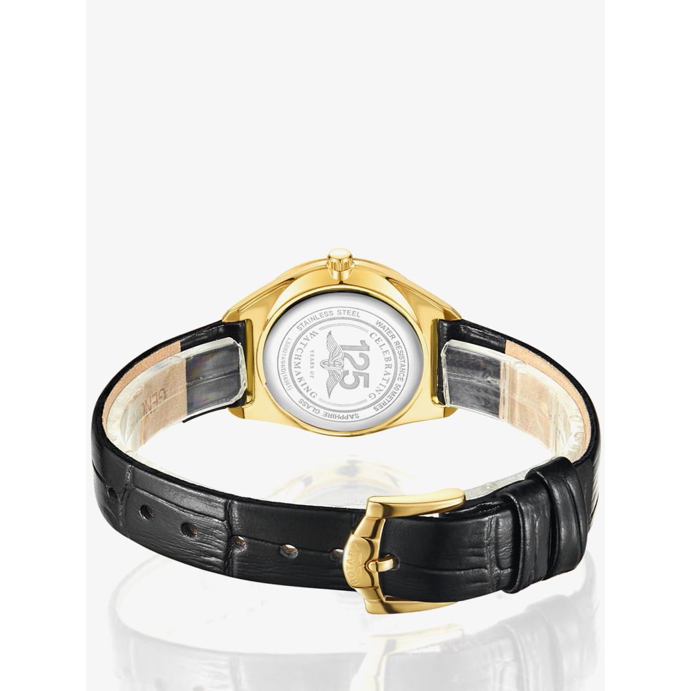 This Ultra Slim model has been crafted with a yellow gold tone stainless steel case that features a patterned gold dial with matching yellow gold tone hands and hour markers. This model has been finished with a black leather strap which complements it perfectly.