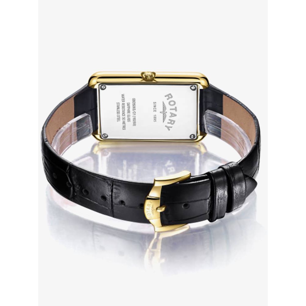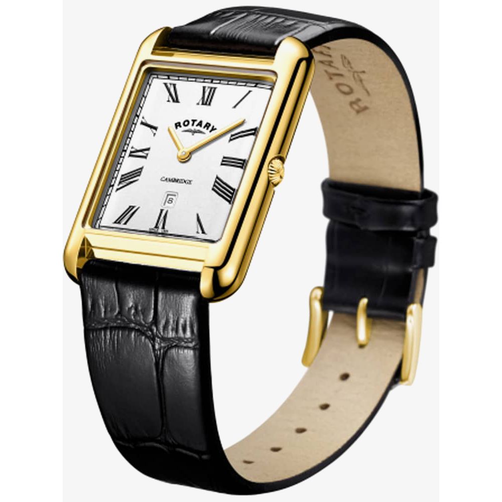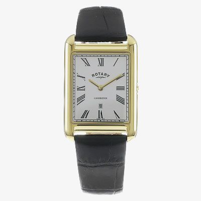 This classically styled mens timepiece offers a white rectangle dial complete with slim fitting hands and black Roman numeral hour markers along with a fully functioning date window. Fastens securely using a black genuine leather strap.