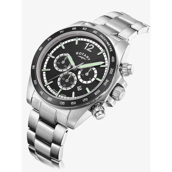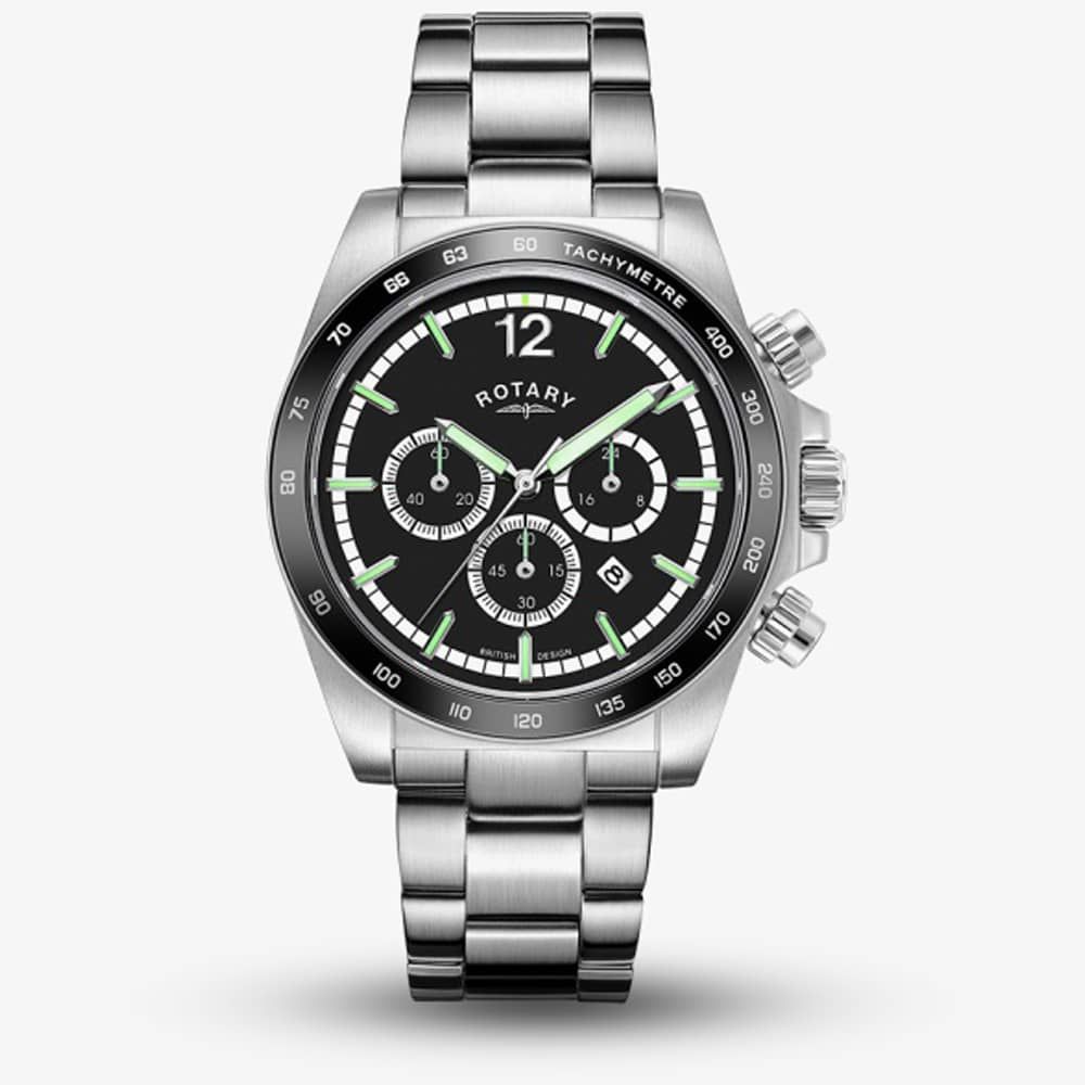 The Rotary Mens Henley Chronograph Black Dial GB05440/04 watch combines a 41mm round shaped stainless-steel case and silver stainless steel bracelet with a fold over clasp. It has a black analogue dial with luminescent hands, date display, chronograph sub-dials, a tachymeter scale which is protected beneath sapphire crystal glass. Power is generated by the quartz movement. This model also has a water resistance of up to 100 metres.