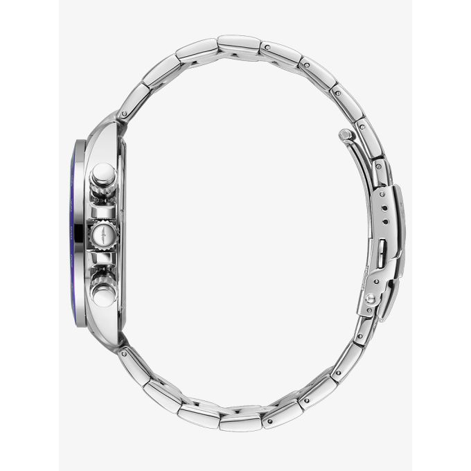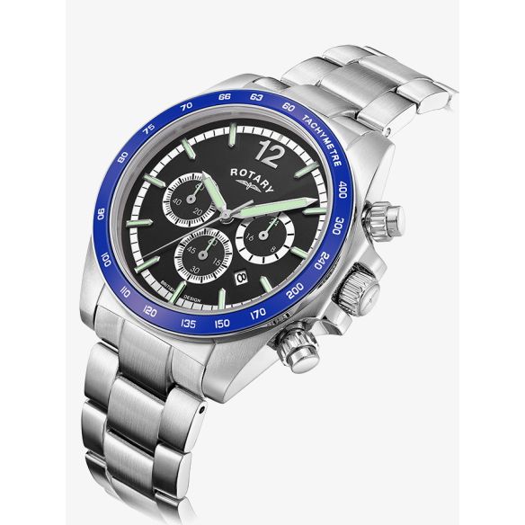 The Rotary Mens Henley Chronograph Blue Bezel GB05440/72 watch combines a 41mm round shaped stainless-steel case and silver stainless steel bracelet with a fold over clasp. It has a black analogue dial with luminescent hands, date display, chronograph sub-dials, a tachymeter scale which is protected beneath sapphire crystal glass. Power is generated by the quartz movement. This model also has a water resistance of up to 100 metres.