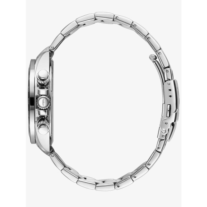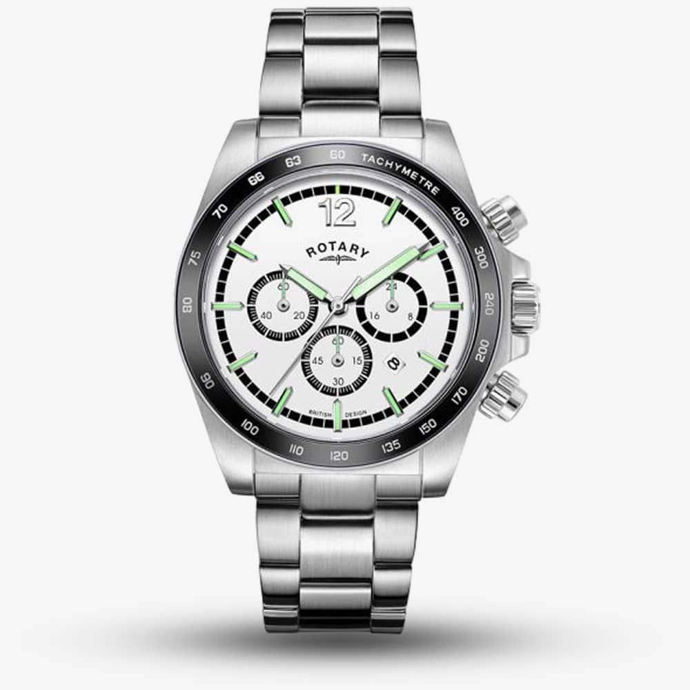 The Rotary Mens Henley Chronograph White Dial GB05440/02 watch combines a 41mm round shaped stainless-steel case and silver stainless steel bracelet with a fold over clasp. It has a white analogue dial with luminescent hands, date display, chronograph sub-dials, a tachymeter scale which is protected beneath sapphire crystal glass. Power is generated by the quartz movement. This model also has a water resistance of up to 100 metres.