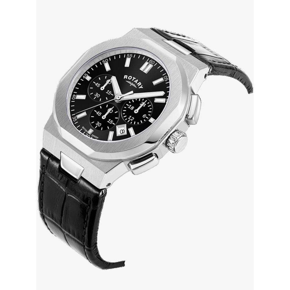 The Rotary Mens Regent Chronograph GS05450/65 watch combines a 41mm round shaped brushed stainless-steel case and black leather strap with a traditional buckle. It has a black sunray analogue dial with luminescent hands, date display & chronograph sub-dials which are protected beneath a scratch resistant sapphire crystal glass. Power is generated by the quartz movement. This model also has a water resistance of up to 100 metres. Case Depth. 11.35mm.