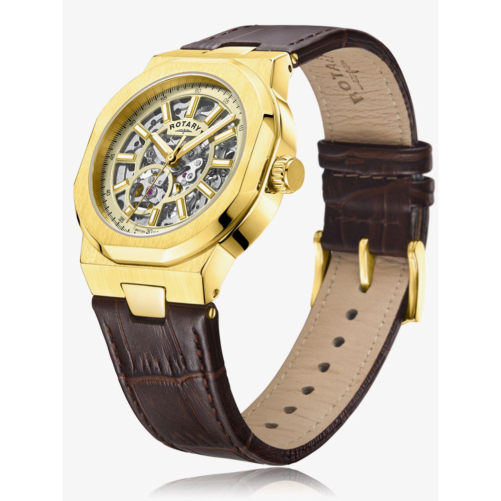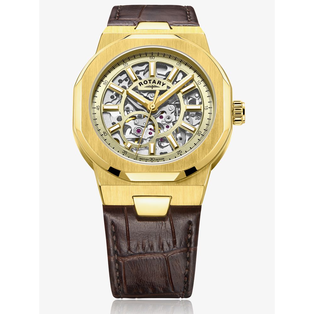 The Rotary Gents Regent GS05418/03 watch combines a 40mm round shaped yellow gold PVD coated stainless steel case and brown leather strap with a traditional buckle. It has a skeleton analogue dial with luminescent hands & hour markers which are protected beneath a sapphire crystal glass. Power is generated by the automatic movement. This model also has a water resistance of up to 100 metres.
