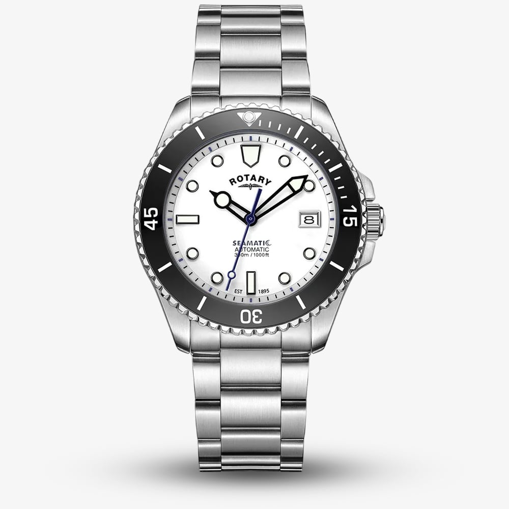 A sophisticated timepiece that blends classic elegance with modern functionality. The fresh white dial ensures you stand out from the crowd, whilst the stainless steel case offers durability and a refined finish. A date window at 3 o’clock adds practical convenience, and the luminous hands ensure clear visibility in low light. Water-resistant up to 300m and built with precision, this Rotary Seamatic is the perfect companion for travellers and professionals.