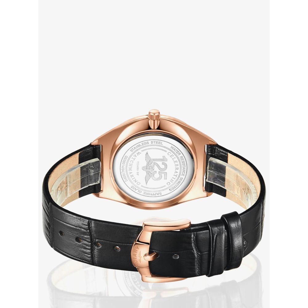 This Ultra Slim model has been crafted with a rose gold tone stainless steel case that features a black dial with contrasting rose gold tone hands and hour markers. This model also features a date display and has been finished with a black leather strap which complements it perfectly.