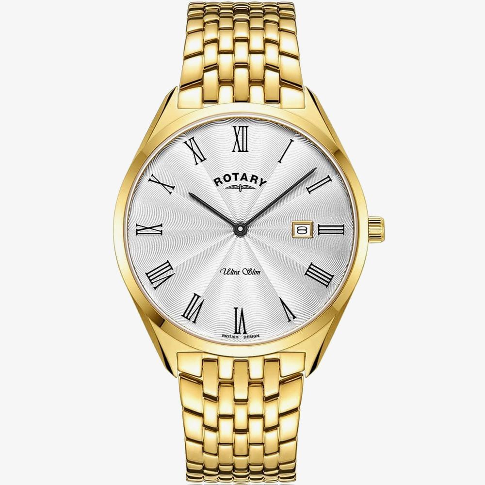 This Ultra Slim model has been crafted with a yellow gold tone stainless steel case that features a silver dial with easy to read black tone hands and roman numerals. This model also features a date display and has been finished with a yellow gold tone bracelet which complements it perfectly.